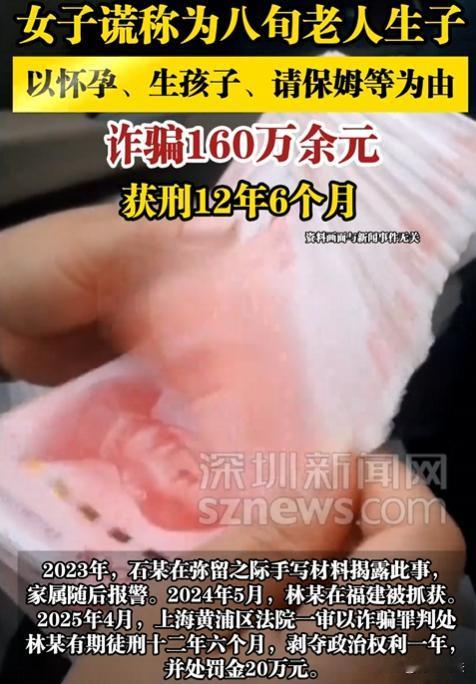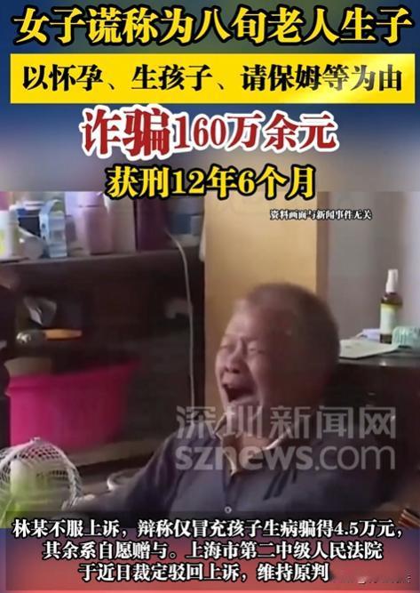 上海,32岁女子与70岁老人发展成男女关系,一年后女子谎称给老人生了个儿子,3年里向老人索要160万元,老人弥留之际写下相关材料,家属报警后女子被抓。女子一审被判12年6个月、罚金20万,她不服上诉,称只骗4.5万其余是赠与,二审法院最终这样判! ( 信息来源:红星新闻) 32岁的女子林某,2019年到上海工作,她结识了七旬老人石某,当时林某或许觉得石某经济条件不错,便主动接近,一来二去,两人发展成了男女关系。 到了2020年,林某回了福建老家结婚生子,可她心里还惦记着石某的钱,这心思一歪,坏主意就冒出来了。 她竟然谎称给石某生了个儿子,这谎言一出口,就像打开了潘多拉的魔盒,后面一系列的骗钱手段接踵而至。 林某开始以各种理由向石某要钱,一会说孩子生病需要手术费,一会说孩子要上好学校得交赞助费,各种借口五花八门。 石某年近八旬,身体本就不太好,又对这个“儿子”满心期待,哪里会想到这是林某的骗局,他每次都毫不犹豫地把钱给林某,三年多的时间里,林某从石某那里骗走了160多万。 石某的身体越来越差,到了弥留之际,他心里还惦记着这个“儿子”,手写了相关材料,把事情的经过都写了下来。 石某去世后,家属在整理遗物时发现了这份材料,这才知道林某的所作所为,气愤不已的家属报了警。 民警调查后,很快就锁定了林某,并将其抓获。 一审法院经过审理,认定林某以非法占有为目的,虚构事实骗取他人财物,数额特别巨大,构成诈骗罪,判处她有期徒刑12年6个月,并处罚金20万,同时责令她退赔违法所得。 林某不服一审判决,提出了上诉。 她声称自己只骗了4.5万,其余的钱都是石某自愿赠与给她的。 这一说法,石某的家属并不认可,他们觉得林某就是在狡辩,想逃避法律的制裁。 林某所获的160多万,究竟是诈骗所得,还是石某的赠与呢?林某坚称是赠与,可石某家属认为这是林某精心设计的骗局。 林某的行为,明显存在很大问题,她虚构怀孕生子的事实,利用石某对孩子的期待,不断索要钱财。 而石某因为年龄大了,渴望有后代,在林某的欺骗下,陷入了错误的认知,才会一次次地给钱。 那从法律角度来看,这到底该怎么认定呢? 法律上对于诈骗罪和赠与行为,有着明确的界定。 根据《刑法》规定,诈骗罪是指以非法占有为目的,用虚构事实或者隐瞒真相的方法,骗取数额较大的公私财物的行为。 林某虚构为石某怀孕生子的事实,又编造孩子生病等理由向石某索要钱财,主观上具有非法占有石某财物的目的。 她通过虚构事实的手段,使石某陷入错误认识,进而处分自己的财产,将钱交给林某,这完全符合诈骗罪的构成要件。 而赠与,是赠与人将自己的财产无偿给予受赠人,受赠人表示接受的一种行为。 赠与行为,是基于赠与人真实的意思表示,并且赠与人清楚知道自己的行为后果。 石某给林某钱是因为相信林某为他生了儿子,是基于这个错误的认识才给的钱,并非真实意愿的无偿给予。 所以,林某所说的赠与,根本不成立。 二审法院经过仔细审理,认为林某的辩解前后矛盾,与事实严重不符,石某的赠与行为是基于林某虚构的事实产生的错误认识,并非真实意思表示。 最终,二审法院维持了一审判决,驳回了林某的上诉。 如果林某在行骗过程中,有部分钱财确实是石某主动提出给予,且没有明确是基于“儿子”这一错误认识,这部分钱财,还能认定为诈骗所得吗? 根据《刑法》规定,诈骗罪,要求行为人通过虚构事实或隐瞒真相,使对方陷入错误认识而处分财产。 若石某主动给予钱财时,并非因林某虚构的“儿子”相关事实而陷入错误认识,如果是基于两人曾经的男女关系等其他原因,那么,这部分钱财就不符合诈骗罪中因错误认识处分财产这一范畴。 但需要结合具体证据,如双方交流记录、证人证言等,来综合判断石某给予钱财的真实原因。 如果能证明这部分钱财的给予与林某虚构事实无关,则这部分不应认定为诈骗所得。 林某在上诉过程中,如果能够提供新的证据证明部分钱财是石某自愿赠与,二审法院会如何处理? 依据《刑事诉讼法》规定,二审法院审理上诉案件,应当按照下列情形分别处理,其中对于原判决认定事实不清楚或者证据不足的,可以在查清事实后改判,也可以裁定撤销原判,发回原审人民法院重新审判。 如果林某能提供新证据,证明部分钱财是石某自愿赠与,二审法院会审查该证据的真实性、合法性和关联性。 如果新证据确实能证明部分钱财性质为赠与,二审法院将会对原判决中涉及这部分钱财的认定进行改判,调整诈骗金额,进而可能影响最终的量刑。 有些人为了钱不择手段,利用他人的情感弱点进行诈骗,就像林某,利用老人渴望有后代的心理,精心设计骗局,这种行为,给受害者带来了巨大的经济损失。