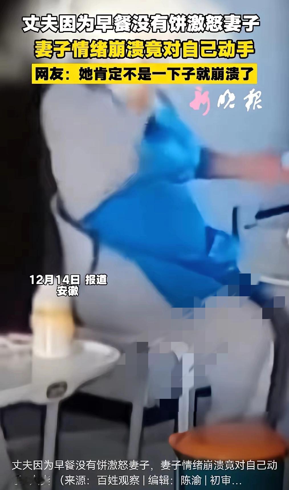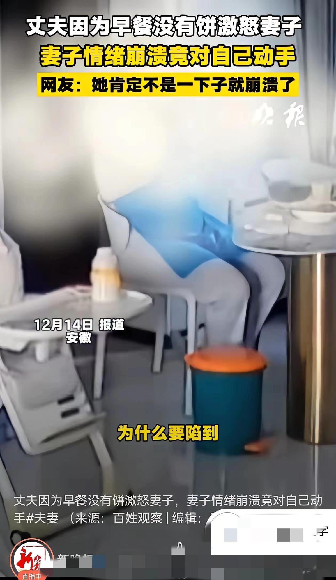 多痛啊?安徽的一位妻子,因为辛苦做了早餐,但是却被丈夫指责缺了一块饼。此时她的情绪再也崩不住了,坐在餐桌前,哭诉:“我为什么会陷在这样一个家庭里……” 真的看不得女人这样崩溃,那一声声耳光扇在自己脸上,听得人心里发紧。她哪是因为一块饼委屈,分明是攒了无数次失望,终于扛不住了。怀里要哄娃,手边要忙家务,夜里睡不安稳,天亮还要急匆匆凑出一顿早饭,连轴转的日子没歇过,满心付出在丈夫眼里,竟只换来一句缺块饼的指责。 婴儿车就搁在桌边,奶瓶还摆在上面,她的世界全围着孩子和家庭转,可丈夫眼里看不到她的忙碌,只盯着餐桌少了点东西。那些被忽略的疲惫、不被认可的付出,全在那刻翻涌上来,吵不动也辩无力,只能对着自己下狠手,把委屈全撒在自己身上,耳光打在脸上,疼的却是寒透的心。 婚姻里最伤人的从不是大事,是看不见的敷衍和理所当然,把伴侣的付出当本分,慢慢就耗光了真心。女人要的从不是多好的物质,不过是一份体谅,一句认可,可这点温暖偏偏最难求。 你觉得婚姻里,比缺块饼更让人寒心的,是丈夫的忽视还是不被理解?