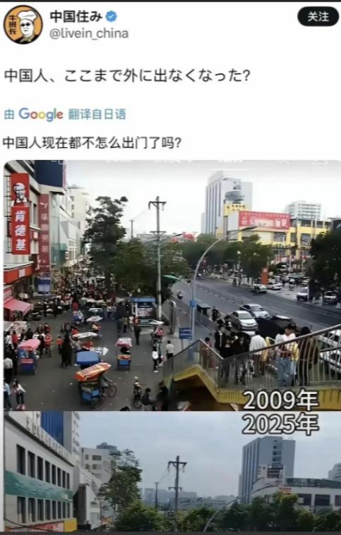 果不其然。 日本网友突然抛出了一个疑问:中国人现在都不出门了吗? 这两天一张 2009 年和 2025 年的中国街景对比照在 X 平台刷屏,直呼 “同一地点人少了”,还纠结是 “经济走弱” 还是 “生活方式换赛道”。 看了日本网友这个疑问,我真是觉得又好笑又无奈!中国人哪是不出门了,分明是咱们的生活方式早就换了赛道,这些外国朋友还拿 2009 年的老眼光看现在的中国,难怪会闹误会! 2009 年的时候,大家买个菜得跑菜市场,买件衣服得逛商场,吃饭要么在家做要么去饭馆排队,出门办事更是得一趟趟跑部门,那时候街上能不挤吗? 可现在不一样了,咱们的生活早就被数字化和城市发展给彻底改变了,不是不出门,是出门的方式、地方和目的都跟以前完全不同了! 就说最基本的吃饭购物吧,2009 年谁听说过外卖能送上门?那时候饿了要么自己开火,要么穿街走巷找餐馆,现在手机点一点,半小时不到热饭菜就送到家,2024 年咱们的外卖市场规模都突破 1.6 万亿了,这可不是小数目啊! 购物就更不用说了,2009 年网购还只是少数年轻人的新鲜事,现在从刚会用手机的老人到小孩子,谁没在网上买过东西?2025 年前三季度,全国网上零售额都超过 11 万亿了,光实物商品网上销售就占了社会消费品零售总额的四分之一,相当于每花四块钱就有一块钱是在网上花的。 以前逛街是为了买东西,现在大家网上比价、下单,省时又省力,谁还愿意顶着太阳、冒着寒风在大街上瞎转悠?那些说街上人少就是经济不行的,看看这些数据就知道,咱们的消费力根本没减,只是从线下转到线上了! 再说说城市发展带来的变化,2009 年的时候,一个城市就那么几个核心商圈,大家买东西、逛街都挤到一块儿,街上能不人山人海吗? 可现在不一样了,城市越建越大,商业体越开越多,就拿上海来说,现在光城市商业综合体就有 327 家,每个区、每个社区周边都有超市、商场和便民服务点,走路十分钟就能满足日常需求,谁还非得跑到市中心的老商圈去? 我家楼下的社区商场,这两年客流量涨了 60%,里面吃饭、购物、遛娃、健身啥都有,晚上还有深夜食堂,年轻人聚会、老年人遛弯都在这儿,热闹得很。 以前大家都挤在一条街上,现在人流被分散到了城市的各个角落,单个街景看着人少了,但整体的消费活力一点没减,上海那些社区商场的销售额都涨了 58%,这能叫经济走弱吗? 还有出行方式的改变,也让街上的行人看着少了。2009 年的时候,全国地铁运营里程才 1000 多公里,私家车也才 6000 多万辆,大家出门要么挤公交,要么骑自行车、步行,街上自然全是人。 可现在呢?2025 年全国地铁运营里程都快 1.1 万公里了,2 月份一个月就送了 24 亿人次,相当于每个中国人平均坐了一次多地铁。私家车更是普及到了家家户户,全国汽车保有量都 3.6 亿辆了,很多家庭一户就有两三辆车,还有网约车、共享单车随时能用。 现在大家出门,从家到车上,从车上到目的地,步行的路段越来越短,街上看着行人少了,但实际出行的人次比 2009 年多了好几倍。 至于说经济走弱,那更是无稽之谈!2009 年中国的 GDP 才 30 多万亿,到 2023 年已经涨到 129 万亿了,十几年翻了四倍还多,这要是经济走弱,怎么可能有这么快的增长? 老百姓的钱包也越来越鼓,消费能力越来越强,2025 年上半年社会消费品零售总额就涨了 5%,服务消费还涨得更快,在线旅游、文化娱乐这些消费都在大幅增长。 大家不是不花钱,是花钱的地方变了,以前花在逛街购物上的钱,现在更多花在了旅游、健身、教育、文化体验上。 2025 年上半年在线旅游增长了 77.6%,大家都愿意出门去看看祖国的大好河山,只是不再集中在传统的商业街了。那些说经济不行的,要是来中国的景区、健身房、电影院看看,就知道咱们的消费有多火爆,生活有多精彩! 其实说到底,日本网友的疑问,本质上是没跟上中国的发展速度。他们还以为街上人多就是经济好,却不知道中国早就从 “逛街时代” 进入了 “精准消费时代” 和 “品质生活时代”。 现在的中国人,不出门能办事、能消费,出门能旅游、能休闲,这是生活水平提高的表现,是社会进步的结果。 要是日本网友真的想来了解中国,就别光看几张街景照片下结论,不如亲自来中国走一走、看一看。 去社区商场感受一下热闹的烟火气,去地铁站体验一下便捷的交通,去景区看看熙熙攘攘的游客,再看看我们手机里五花八门的 APP,从外卖、网购到政务服务,应有尽有。 到那时候他们就会明白,中国人不是不出门了,而是用更舒适、更便捷、更丰富的方式享受生活去了,这背后是中国经济的持续发展和社会的不断进步,这种变化,是任何照片都拍不全、任何老眼光都看不懂的!