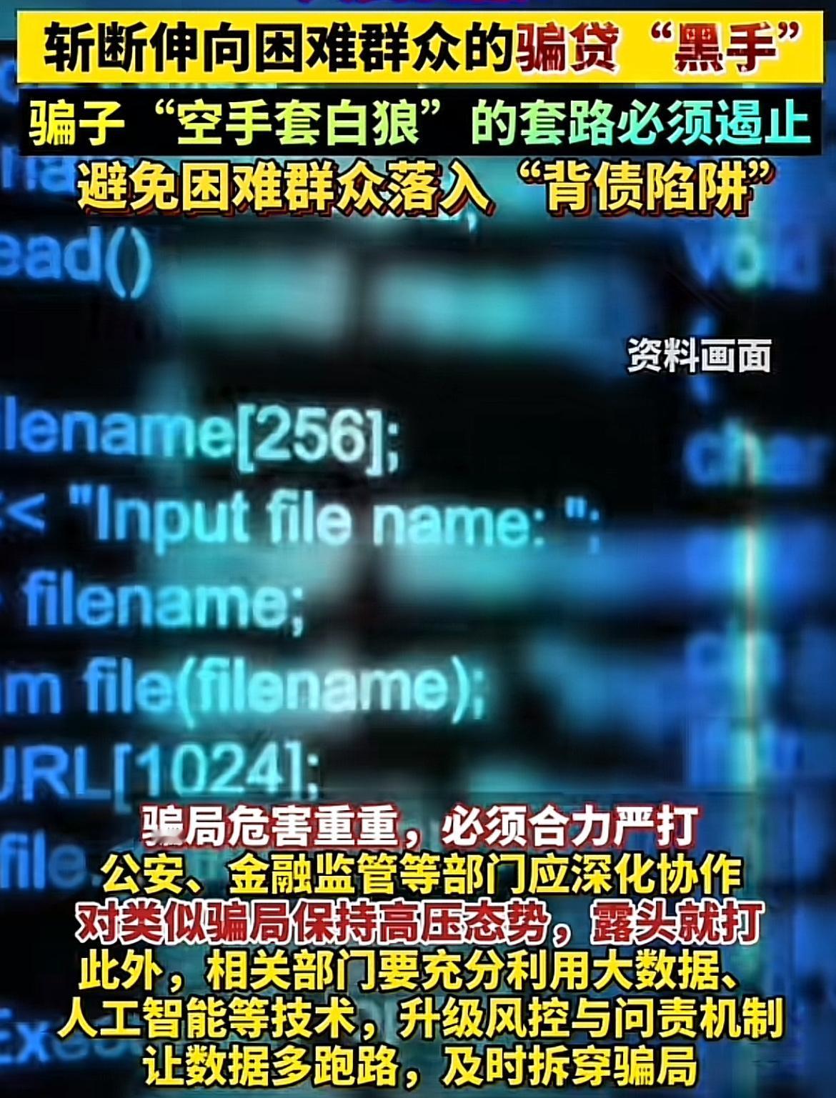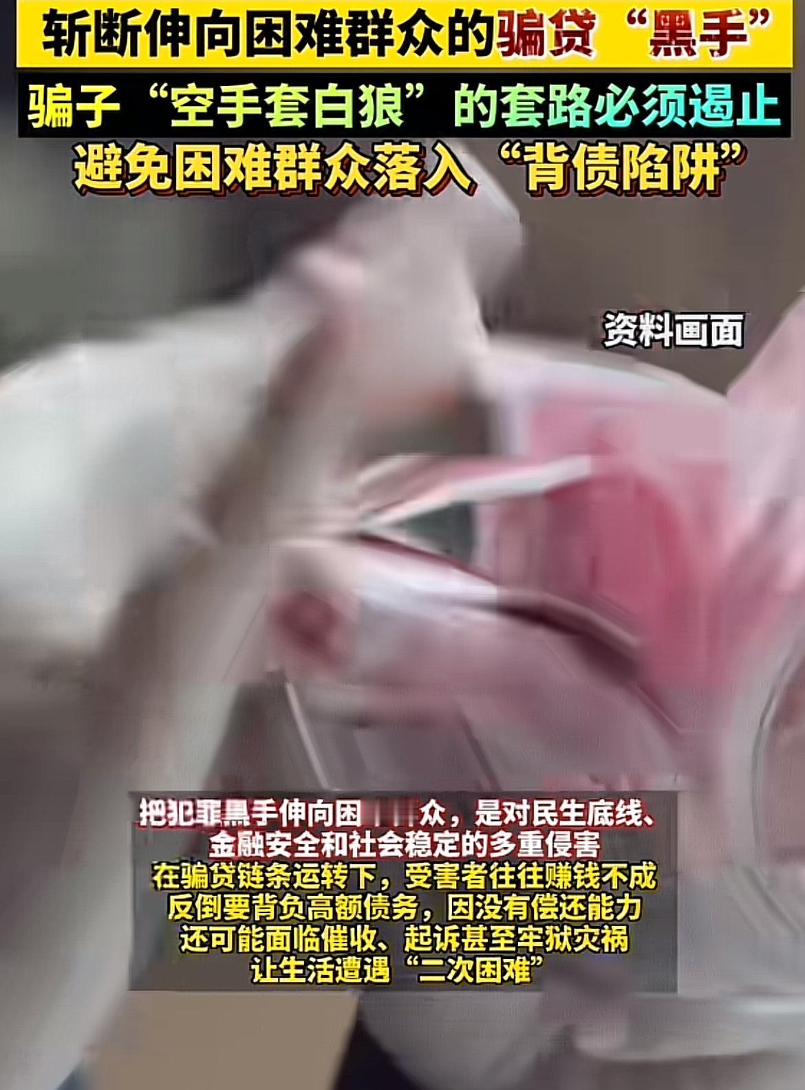 最近,“背债陷阱”骗局频发,太坑人了!就像江西萍乡那起案件,不法分子用“不用还钱,分你一半贷款”的鬼话,让困难群众配合骗贷。要是骗子跑了,群众就得背债,还得担法律风险。 这些骗子套路深,先挑经济困难、对贷款陌生的人,再用虚假承诺诱导,最后伪造材料骗贷。“职业背债”也是类似,以“快速致富”为诱饵,伪造资料,抽取高额分成,把风险全丢给背债人。 一旦陷入,不仅要承担高额债务、信用受损,还可能惹上法律麻烦。大家一定要警惕,别被这些“黑手”骗了!