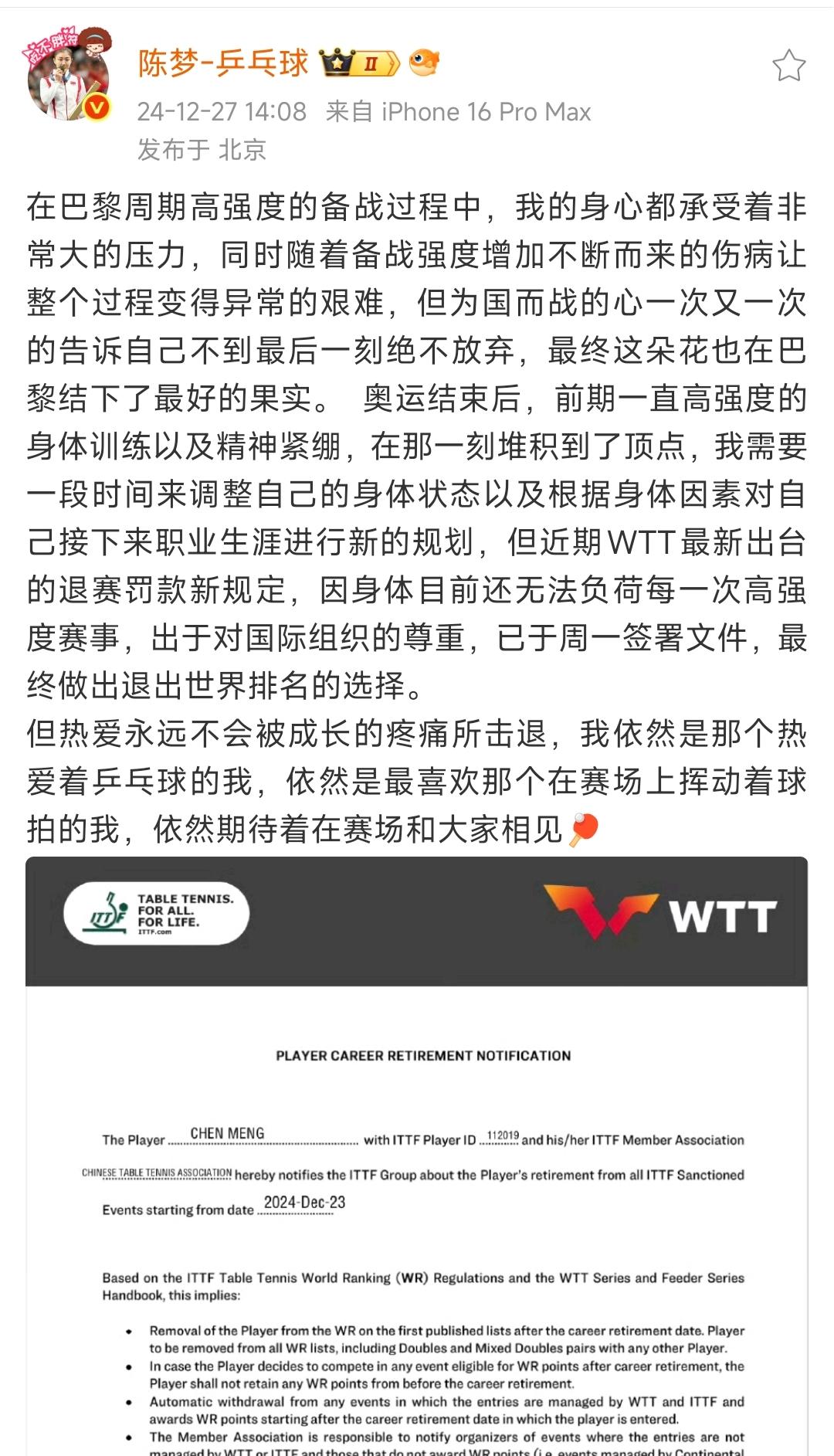 从孙颖莎、王楚钦因伤相继退出WTT香港冠军赛看WTT赛事安排是否合理性 要从2024年12月27日樊振东陈梦相继退出WTT世界排名说起,两位奥运冠军都在退出声明中提到巴黎奥运周期由于种种原因造成身体和心理的巨大消耗,都需要一定的时间去调整,但WTT出台规定:不参赛就罚款的强制规定,两人都无力承受退出世界排名。 两人世排的退出换来了WTT给奥运冠军增加了2站免于处罚的退赛。在当时主力运动员也纷纷给WTT提出了许多的意见,但对赛程方面主力现役的运动员还是持认可态度!所以目前中国乒协还是要进一步和WTT沟通,要保护本国运动员的健康为前提。一味的压榨,密集参赛,身兼多项都是不合理也不持久的! 两位世排第一因伤退赛就是给大家敲响了警钟,希望得到中国乒协、WTT和国际乒联的重视,为运动员良性持久的竞争做出改变!WTT香港总决赛2025 王楚钦 孙颖莎