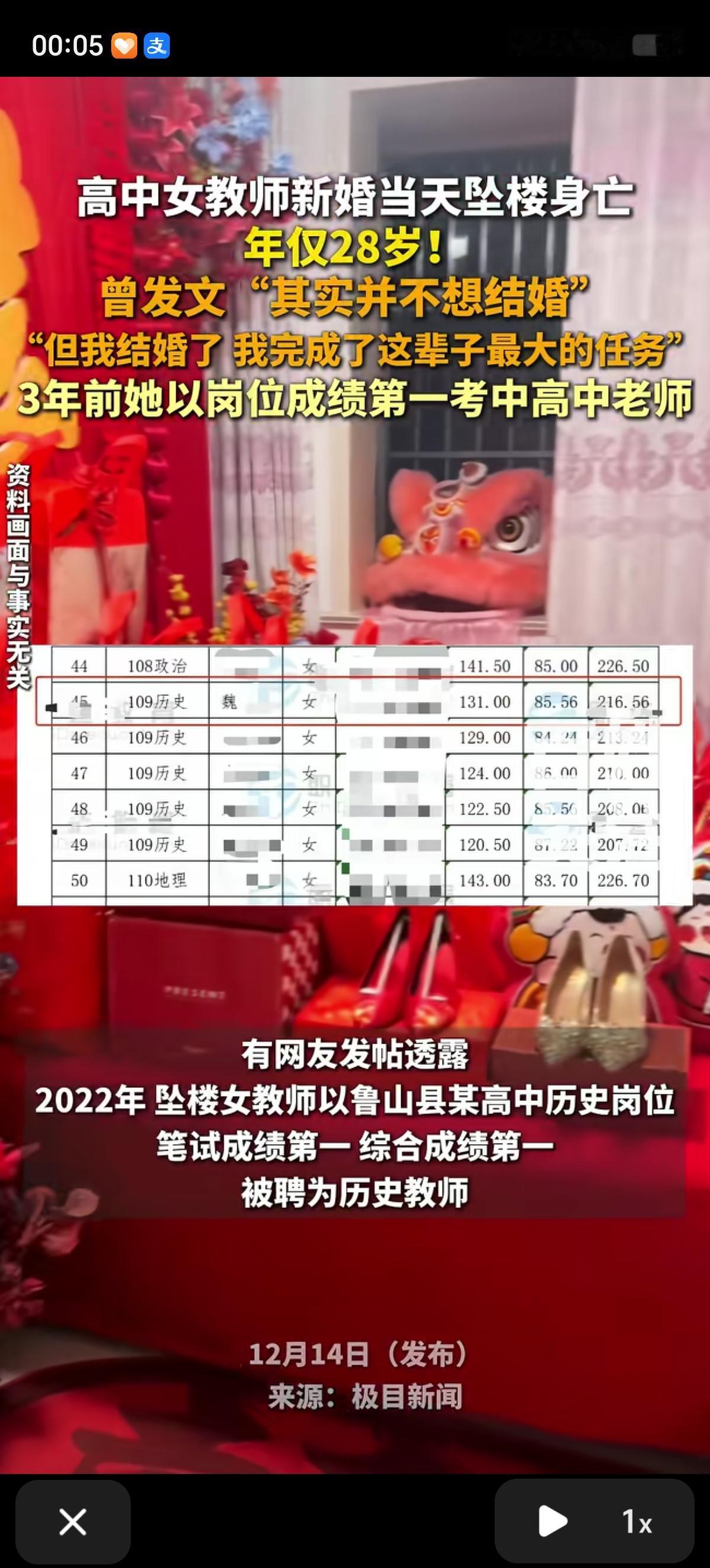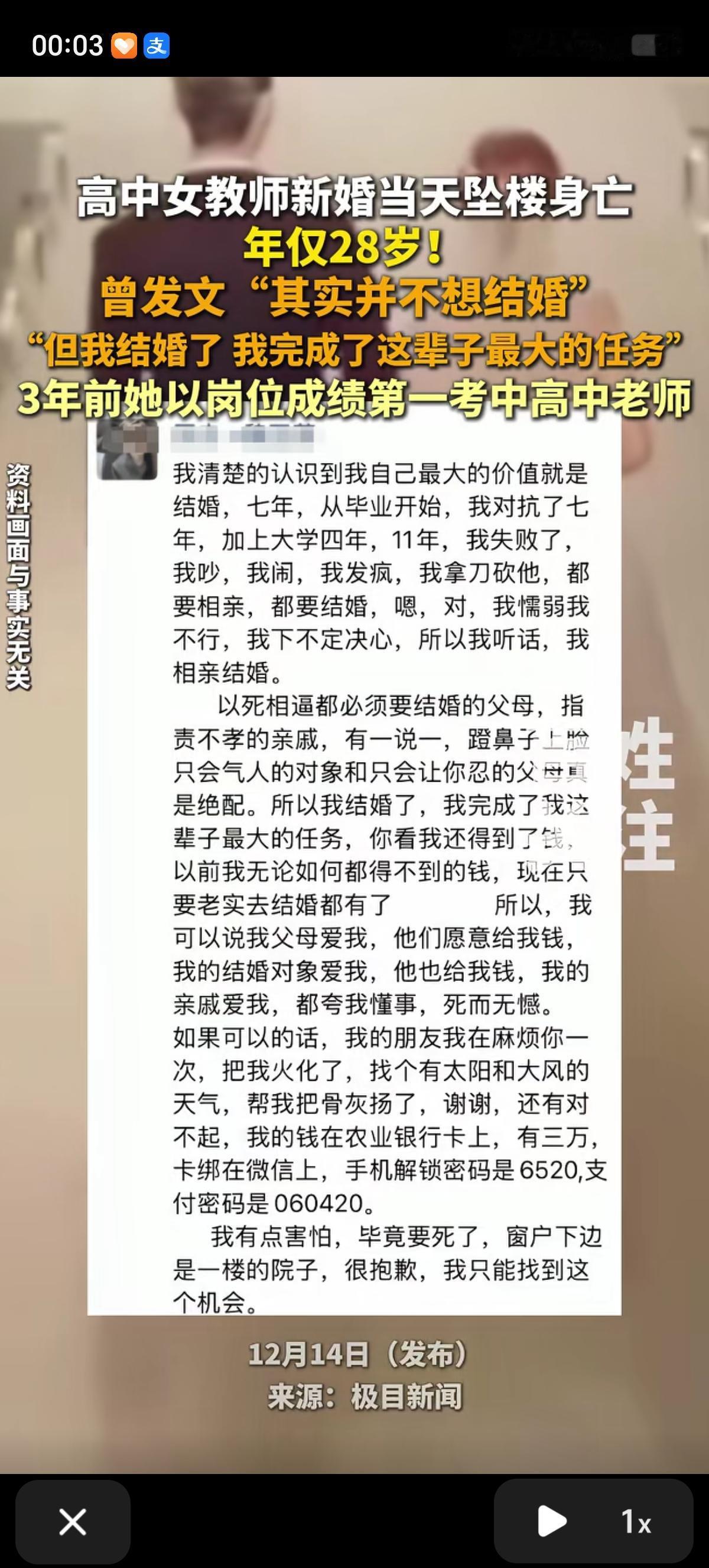 河南平顶山的一个高中老师在新婚当天跳楼了,可坑苦了新郎,洞房都没入,媳妇就没了,明明他没做错什么,还很喜欢新娘,给新娘发红包啥的也不含糊。 新娘的父母也很爱女儿,零花钱也不少给,亲戚也都夸这个老师懂事。没想到以第一的成绩当上老师的她,看上去完美幸福的人生,竟然存在这么大的怨气。 说她不孝顺吧,还知道把自己的存款留给父母。说她孝顺吧,她憋了个大的,把自己弄没了。 只能说很执拗的父母遇上了同样很执拗的女儿,谁也不退一步。父母强势,女儿反抗不了就让自己消失。 爱情这个事情就是缘分,缘分没到就是缘分没到,急也急不来。女儿不想结婚恋爱啥的,就是她的正缘没来。要是正缘来了,赶也赶不走,父母不想她嫁人都不行。 现在年轻人流行晚结婚、晚生小孩,40多岁了孩子才上幼儿园的不要太多。想要小孩,不要孩子他爸的也不少,当父母的最终目的就是希望儿女幸福,她不想结婚就代表姻缘没来,强求不得。