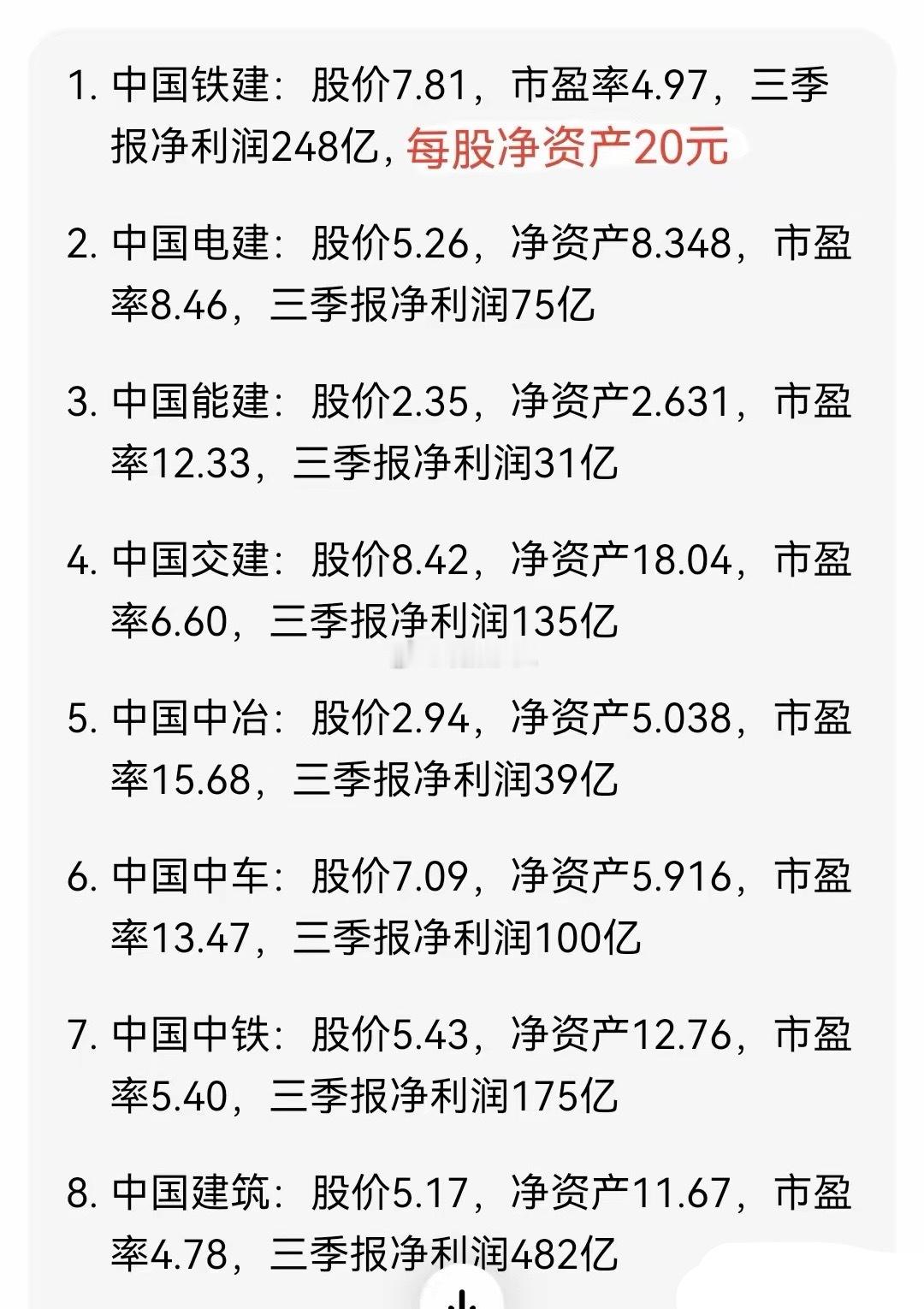 跌破净资产,还在3000点挣扎的业绩增长个的8家A股上市公司。中国铁建每股净资产高达20元,还多一点。不过公司的当前股价7.8元,三季报净利润248亿。中国电建:每股净资产8.38元,当前股价5.26元,市盈率8.46倍,三季报净利润75亿。中国中铁每股净资产12.76元,上证指数涨了1000点,该股价一动未动。至今还是5.34元。