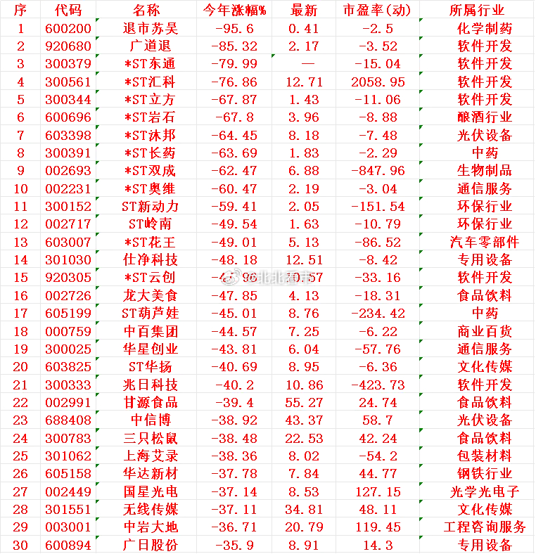 2025年以来,整个市场“跌幅最大”的30个股!退市苏吴:今年涨幅 -95.60%,市盈率(动态) -2.50广道退:今年涨幅 -85.32%,市盈率(动态) -3.52*ST东通:今年涨幅 -79.99%,市盈率(动态) -15.04*ST汇科:今年涨幅 -76.86%,市盈率(动态) 2058.95*ST立方:今年涨幅 -67.87%,市盈率(动态) -11.06*ST岩石:今年涨幅 -67.80%,市盈率(动态) -8.88