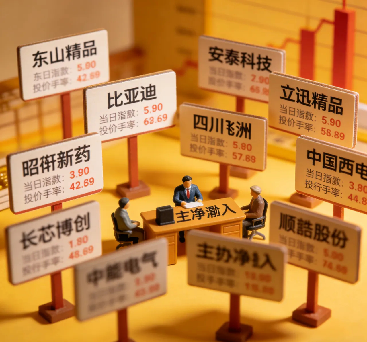 主力资金抢筹榜:10只获大额流入个股全解析1. 东山精密:主力资金净流入11.14亿元,当日股价上涨7.75%,报收84.86元,换手率达10.50%。作为全球头部PCB制造商,公司在AI算力、PCB及光模块赛道竞争力突出,业绩增长预期明确,因此吸引大量主力资金布局。2. 安泰科技:主力净流入8.13亿元,股价收获涨停,涨幅9.98%,收盘价20.32元,换手率3.77%。据2025年三季报数据,公司每股净资产5.39元、每股收益0.2702元,凭借在可控核聚变、钨钼材料、稀土等领域的核心布局,搭上相关产业发展快车,发展前景被市场普遍看好。3. 比亚迪:主力资金净流入7.77亿元,当日小幅上涨0.80%,股价报97.34元。2025年三季报显示公司营收与净利润双双大幅增长,基本每股收益达2.56元,其在新能源汽车和电池领域的龙头地位稳固,长期发展空间广阔。4. 立讯精密:主力净流入6.08亿元,股价上涨3.66%,收盘价60.27元。这家消费电子龙头近年积极拓展汽车电子、储能等新赛道,尤其在人形机器人领域储备深厚,特斯拉审厂落地的利好,有望为其打开全新增长空间。5. 四川九洲:主力净流入5.17亿元,股价涨停,涨幅9.98%,报收17.85元,换手率12.72%。依托在低空经济、军工信息化领域的独特优势,叠加近期相关业务推进与政策红利加持,公司成功获得资金高度关注。6. 中国西电:主力净流入4.71亿元,股价强势涨停,涨幅10.06%,收盘价9.08元。2025年三季报显示每股净资产4.41元、每股收益0.1831元,作为特高压领域核心企业,伴随国内电网建设持续推进,公司业务有望实现稳步增长。7. 昭衍新药:主力净流入4.19亿元,股价涨停,涨幅9.99%,收盘价34.35元。作为国内药物临床前研究服务龙头,在医药行业研发投入持续加码的背景下,公司订单量与业绩水平同步走高,表现亮眼。8. 长芯博创:主力净流入4.12亿元,股价大涨11.58%,报收148.01元。公司是综合光电互联一站式解决方案提供商,业务覆盖电信、数通、消费及工业互联三大领域,1.6TAEC产品与硅光模块等核心产品竞争力强劲,且绑定谷歌等头部客户,发展潜力十足。9. 中能电气:主力净流入3.60亿元,股价暴涨20.04%,收盘价10.78元。公司业务覆盖储能、充电桩、智能电网等多个赛道,受益于新能源产业的高速发展,市场需求持续攀升,股价随之获得资金强力推动。10. 顺灏股份:主力净流入3.03亿元,股价涨停,涨幅10.00%,收盘价15.95元。公司业务涉足商业航天、太空算力、环保纸等多个新兴领域,凭借近期业务进展与市场向好预期,成功跻身主力资金抢筹名单。