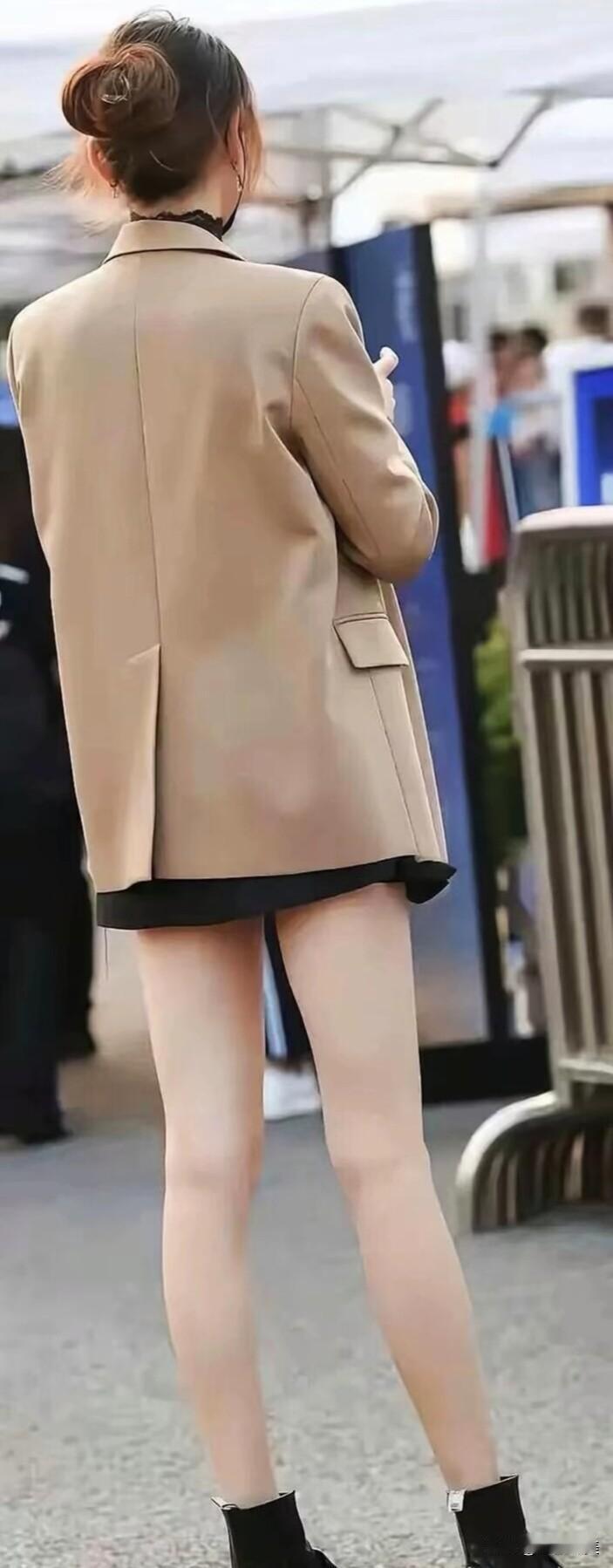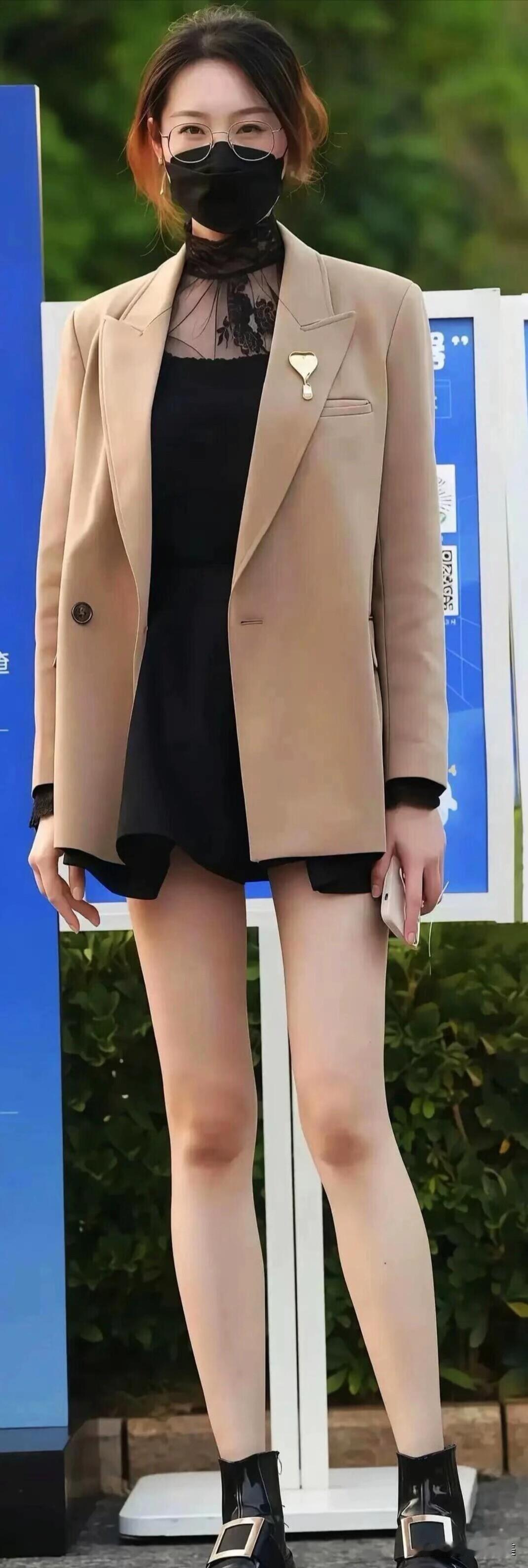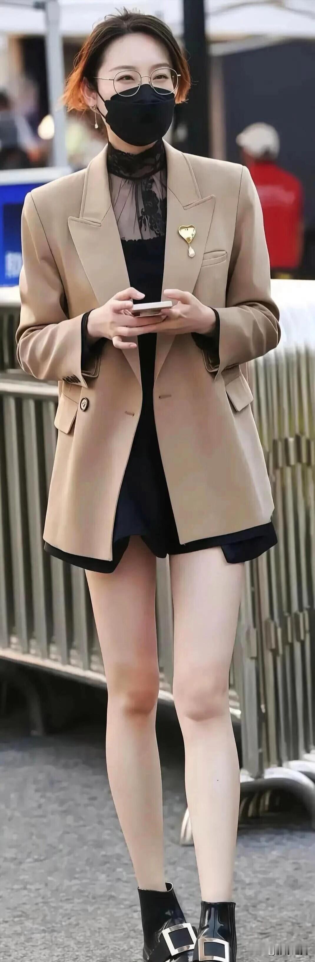 卡其色西装搭黑色内搭,下身配短裤和黑靴,简约又有范儿,日常这么穿挺好看的~
