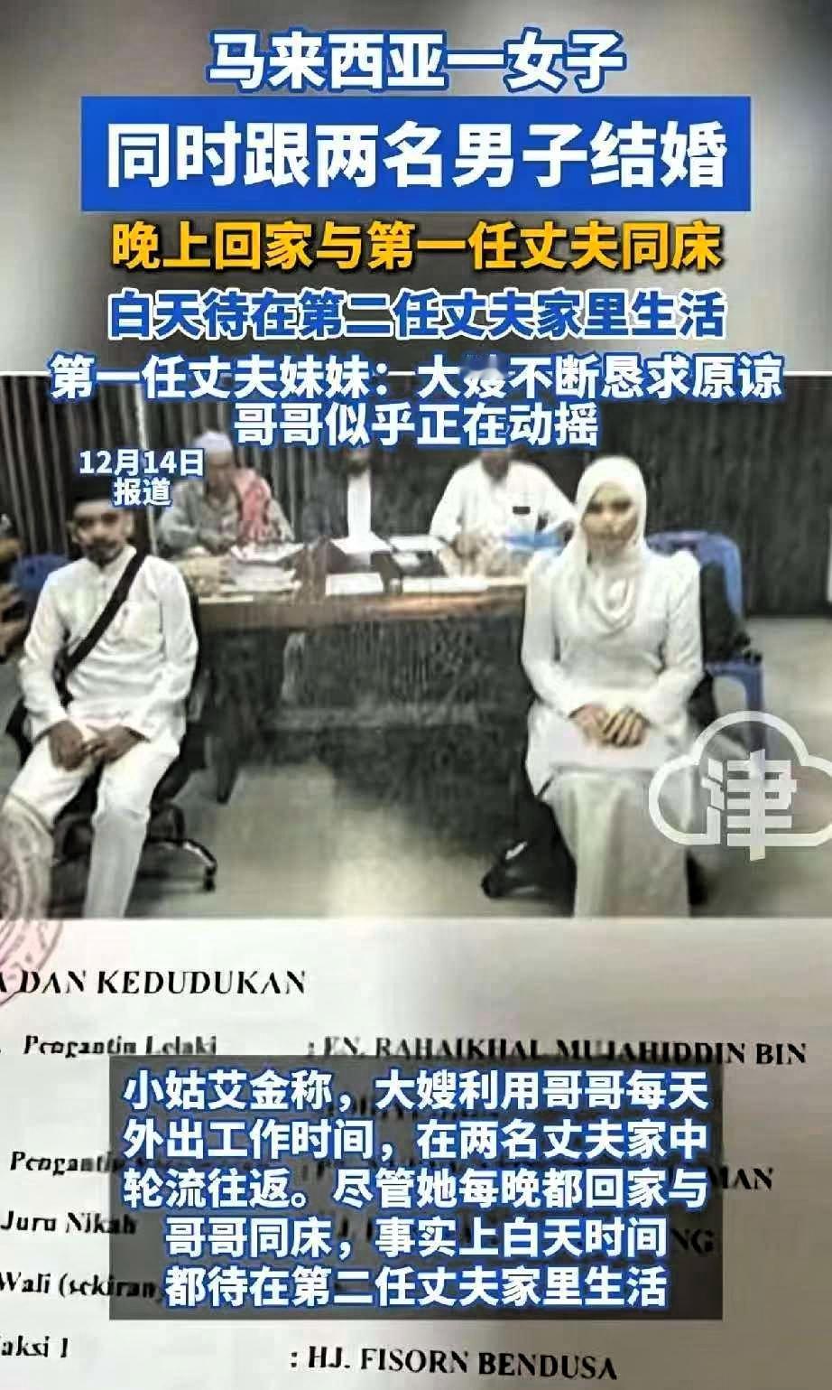 “不服不行”,马来西亚一女子同时和两名男子结婚,每天趁第一任丈夫外出工作的时间,就去到第二任丈夫家里生活,晚上再准时返回和第一任丈夫同住,如此辗转往返,居然长时间没被发现。 这件事的败露,全靠第一任丈夫的妹妹细心观察,发现了嫂子的异常行程。让人意外的是,事情曝光一周后,这名女子不仅没有主动搬离第一任丈夫的家,反而选择报警,指控小姑子对自己进行骚扰。随后她又不断恳求第一任丈夫的原谅,这番操作下来,原本气愤的丈夫竟然也开始动摇。 不少人拿国外婚俗开放说事,但这根本不是一回事。马来西亚虽然有部分宗教群体允许一夫多妻,却有着严格的申请流程和法律约束,这种瞒着原配偷偷和他人组建家庭的行为,和婚俗没有半点关系,本质就是对婚姻的背叛和对他人的欺骗。 婚姻从来不是一个人的随心所欲,忠诚和责任才是婚姻的基石,既想拥有原配提供的安稳生活,又想贪图另一段关系的陪伴,说到底就是极度自私的表现。 信任就像一张纸,皱了之后就算勉强抚平,也恢复不了原来的样子。