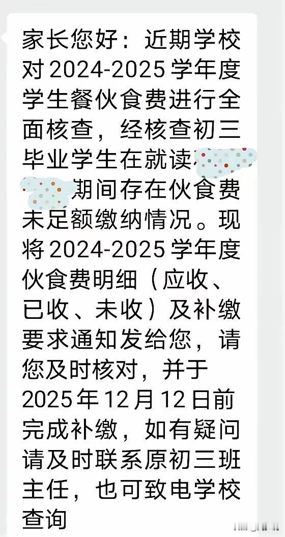 “这财务也太疏忽了吧!”一位家长发文吐槽,老二就读的公办中学7月已毕业,时隔3个月,初三班主任突然私信联系,称因原财务统计出错,需要补交900多元伙食费,且整个年级700多名毕业生都要补。而且原来此前班级群已解散,老师特意单独联系告知补费事宜,让自己又无奈又无语。 事件曝光后,网友议论纷纷。有网友说:“毕业这么久才说算错账,财务工作也太马虎了,家长核对起来都麻烦”。 也有网友质疑:900多不是小数,700多人就是几十万,这么大误差早干嘛去了”? 还有网友则表示:“公办学校收费该更规范,统计出错得给家长更详细的明细才合理”。 在周少看来,其实毕业数月才通知补费,核心问题还是财务工作疏漏。家长配合学校收费是本分,但学校更该做好日常统计核对,及时公示明细,避免事后补账让家长困扰。 总而言之,出现这么大的疏漏确实不应该,希望学校能给出清晰的费用明细,也加强财务管控,别再出现类似情况,让家长放心、省心。#寻美三湘# #长沙新朋友#