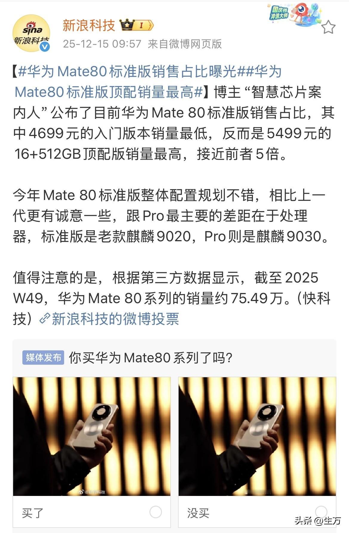 华为Mate80标准版销售占比曝光:顶配的销量是入门版本的五倍! 就在刚才,新浪科技统计了华为Mate80系列手机卖出去各个版本之间的差别,没想到,他这个规律和苹果手机一样,那个配置最高价格最贵的版本卖得最好。 苹果手机也是这个规律,iPhone 17 Pro Max版本要比其他版本卖得好,这种品牌比较靠前的品牌,配置比较高的手机,更加符合这些目标客户,可能对他们来说宁愿多花一点点钱,也要享受到这个品牌生产出来的产品,比较极致的价值和性能。 可能也是这种比较知名的品牌的产品策略与其他品牌不一样的地方,我们日常买东西,衣食住行都追求性价比,尤其是对普通来宝性来说,任何东西便宜一点点,总觉得划算一些,但对一些少数目标客户来说,这规律好像不怎么灵,他们更加追求的是体验感,是这个东西带给他的价值感和情绪体验。 甚至是这个东西能够给他带来稀缺性和身份属性,而很多人是愿意为以上几点在价格上面买单的,这个规律好像不仅仅是在电子消费类产品,在稍微昂贵一点的汽车房产理财等等日常消费类的产品当中都有表现。 而且对企业来说,他们也乐于这样做,首先是能够表现出自己的产品的实力,给自己产品赋予不同的属性,这样反而发展得更加的长久,但是这条路的竞争注定也是比较激烈的,因为好的东西有利益的东西,大家都会加入都会去做,所以这样就是就会成真正的优胜劣汰,反而把好的品牌给筛选出来了。