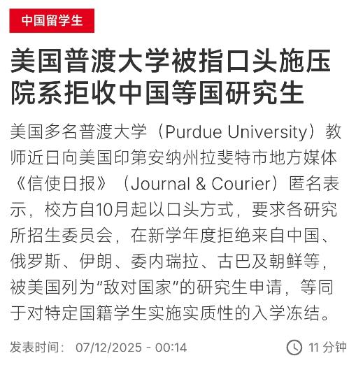 美国普渡大学决定拒招中国留学生,做出这项决定的是该校校长蒋濛。蒋濛出生于天津,在香港长大,后移民美国,2023年出任普渡大学第13任校长。 蒋濛的履历堪称完美,45岁就当上美国顶尖公立大学的校长,这在美国高等教育界都是凤毛麟角。 他本硕博都在斯坦福读的电气工程,2013年拿到艾伦·沃特曼奖,这是美国40岁以下研究人员的最高荣誉。 从普林斯顿教授到普渡工程学院院长,再到校长,蒋濛的学术和管理能力都无可挑剔。 可就是这么一位华裔校长,却在2024年通过不成文的口头指令,要求各院系拒招中国、俄罗斯、伊朗等国的研究生。 这事最让人憋屈的地方在于,校方根本没出任何书面文件,就是通过私下会议和谈话传达的。教职员工接到暗示,就算系里录取了这些国家的学生,研究生院也"极不可能"批准。 这种不留痕迹的操作,既规避了法律风险,又达到了实际禁招的目的。有教授直言,管理层几乎明示他们"别考虑这些国家的申请,或者直接拒掉"。 数据最能说明问题。普渡大学的中国本科生从2013年的3000多人,暴跌到2024年的747人,十年缩水75%。 2024年研究生申请中,中俄学生的拒录率高达98%,而同期印度留学生的录取数却逆势增长12%。这种对比太扎眼了,难怪有人调侃这是"华裔排斥华裔,印度裔帮衬印度裔"。 蒋濛上任后干了几件大事。他推动普渡大学和英特尔、英伟达等24家企业组建领导委员会,搞了个半导体专项学位项目,这个项目恰恰是美国《芯片法案》的重点扶持对象。 他还砍掉了普渡和清华大学的交换项目,这种操作和他印度裔同行形成鲜明对比。德州大学奥斯汀分校的印度裔校长潘尼迦上任后,推动与印度理工学院的联合培养项目,印度留学生占比从18%升到27%。 深层原因其实不难理解。普渡大学是美国最重要的国防科研基地之一,航空航天工程、半导体、高超音速武器研究都和美国国家安全紧密相连。 2023年3月,美国众议院"中共问题特别委员会"就给普渡发函,要求提供中国学生的详细信息,还暗示中国学生可能为中国政府窃取敏感研究机密。普渡迅速配合,提交了中国学生的入学数据和研究领域概况。 美国高校校长看似权力很大,其实深受董事会、捐赠者和政府的多重制约。尤其是公立大学,联邦经费是命脉,一旦违规,不仅面临资金断流,还可能遭遇国会审计。 蒋濛作为华裔校长,在政治压力面前选择了"断臂求生"——限制特定国家学生参与敏感项目,成了最理性的选择。 但这种选择付出的代价是巨大的。中国学生不仅是美国高校的重要财源,更是科研团队的核心力量。 国际学生每年为美国经济贡献约550亿美元,中国学生占了30%以上。很多美国教授私下抱怨,明明中国学生的学习韧劲和实力比其他国家的学生要好,却总是得不到优质资源和帮助。 更让人担忧的是,普渡的案例可能只是个开始。特朗普政府近期频繁对中国留学生采取歧视性、政治性、选择性执法,签证拒签率高达36%。 2025年秋季,中国学生入境美国的人数同比下降26%。美国两党在限制中国留学生接触敏感技术领域上达成共识,这种趋势短期内难以逆转。 对中国学生来说,留学规划需要更加谨慎。美国不再是唯一选择,欧洲、加拿大、澳大利亚等国家的高校都在抢中国生源,而且政策更稳定。国内高校也在崛起,清华大学、北京大学等顶尖学府的全球排名不断提升,本土培养体系日益完善。 普渡事件给所有中国学生和家长提了个醒:留学不再是单纯的学术追求,而是一场需要考量政治风险、政策稳定性的复杂博弈。在学术追求与政策现实之间寻找平衡点,比以往任何时候都更加重要。