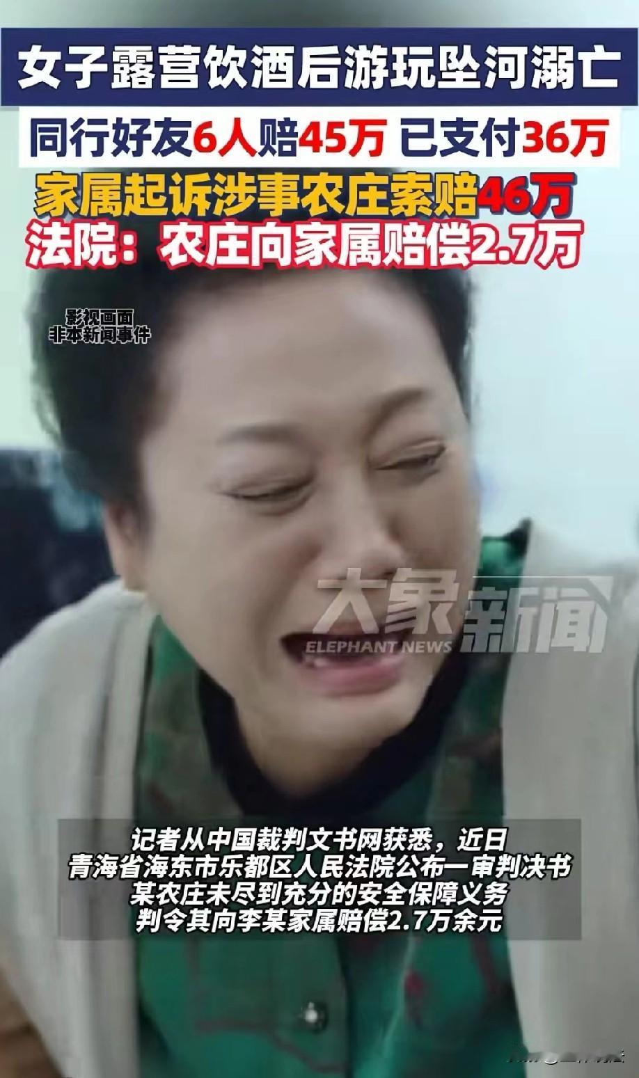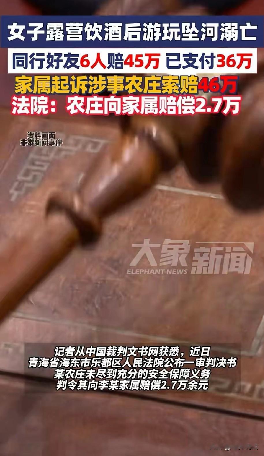 青海海东,女子和6个亲友一同前往某农场露营,喝了几瓶啤酒后,她有些不胜酒力,游玩过程中不小心坠入农场旁边的河里,导致溺亡。事发后,6个亲友出于人道主义,主动提出赔偿45万元,并先支付了36万元。女子家属还不满足又把农场告上法庭,索要46万多赔偿,法院审理后,最终这样判! 2025年8月15日,正是酷暑难耐的季节,李女士约了6个亲友,兴冲冲地赶往当地一家农庄露营,既可以避暑,也能游玩散散心。 农庄里草木葱茏,旁边还有潺潺流淌的引胜河,听着流水,看着花香,这样的好景致让李女士一行人瞬间卸下了平日的疲惫。 几人找了块平坦的草地,支起帐篷,又从农庄旁的商店买了几瓶啤酒,边喝边聊,欢声笑语不断。 李女士酒量不算好,几杯啤酒下肚,脸颊就泛起了红晕,头也微微发沉。 亲友们劝她少喝点,她摆摆手笑着说没事,难得出来放松,尽兴才好。 酒过三巡,李女士起身想去河边走走,吹吹风醒醒酒。亲友们还叮嘱她小心点,别靠近水边,她应了一声,脚步略显虚浮地朝着河道走去。 谁也没料到,这一走,竟成了永别。 没过多久,同行的亲友见李女士迟迟没回来,心里渐渐泛起了嘀咕,赶紧分头去找。 不一会儿,大家在河边看到李某的鞋子,却不见人影时,瞬间慌了神。众人一边呼喊她的名字,一边报警求助。 经过一番紧张搜救,李女士最终被打捞上岸,却早已没了呼吸,确定是不慎坠入河中溺亡的。 突如其来的悲剧,让所有人都陷入了巨大的悲痛。李女士的父母白发人送黑发人,整日以泪洗面,怎么也接受不了女儿离世的事实。 同行的6名亲友更是愧疚不已,虽然知道这事并非自己直接造成,但一想到当时没能看住李女士,心里就针扎似的疼。 为了稍稍弥补这份遗憾,也为了安抚李女士的父母,6名亲友主动提出,愿意凑45万元作为人道主义赔偿。 很快,36万元就先行交到了家属手中。 可李女士的父母依旧难以释怀,他们思来想去,觉得农庄也脱不了干系。好好的人在农庄露营出事,肯定是农庄的安全措施不到位。 悲愤之下,他们一纸诉状将农庄告上了法庭,张口索要46万余元的赔偿。 法庭上,农庄一方觉得十分委屈。他们辩称,农庄早就在河道旁设置了醒目的警示牌,已经尽到了提醒义务,李女士是成年人,酒后擅自靠近危险区域,责任应该自负。 那么,法院该如何审理呢? 《民法典》第一千一百九十八条规定:宾馆、商场、银行、车站、机场、体育场馆、娱乐场所等经营场所、公共场所的经营者、管理者或者群众性活动的组织者,未尽到安全保障义务,造成他人损害的,应当承担侵权责任。 本案中,农庄作为面向公众提供露营服务的经营主体,其场地与引胜河紧密毗邻,应当预见到游客可能靠近河道的潜在风险,该风险与农庄的经营活动直接相关,故农庄对消费者负有安全保障义务。 法院审理查明,农庄虽在门口及树林区域设置了警示标志,但未在河边核心危险区域增设警示,也未加装护栏等实质性防护设施,仅靠“口头提醒”和远离危险区域的警示牌,无法形成有效安全防控。 这种“只提醒不防护”的方式,属于安全保障义务履行瑕疵,因此,农庄未采取物理防护措施,未能尽到最谨慎之注意义务。 但法院同时明确该义务不可苛责扩大,农庄无需对非自身经营范围的河道承担全部安全责任,故仅认定其承担3%的次要责任。 《民法典》第一千一百七十三条规定:被侵权人对同一损害的发生或者扩大有过错的,可以减轻侵权人的责任。 李女士作为完全民事行为能力人,对自身安全负有首要注意义务。 她明知自己酒量不佳,仍饮酒至脚步虚浮,放任自身判断能力和行动能力下降。 而且,她无视亲友“别靠近水边”的叮嘱,在酒后状态下主动前往河道危险区域,对饮酒后靠近河流的高度危险性缺乏足够认知。 最后,农庄已在显著位置设置安全警示标语,李女士应当知晓相关风险却未规避,属于对自身安全未尽到合理注意义务。 李女士的饮酒行为与冒险靠近河道的选择,是导致溺亡事故发生的直接、主要原因,其自身过错程度远高于农庄的安全保障瑕疵。 最终,法院作出判决:认定农庄存在过错,需承担3%的赔偿责任,向李某家属赔付2.7万余元。 一场本该充满欢乐的露营,最终以这样的结局收场,闹了个不欢而散。