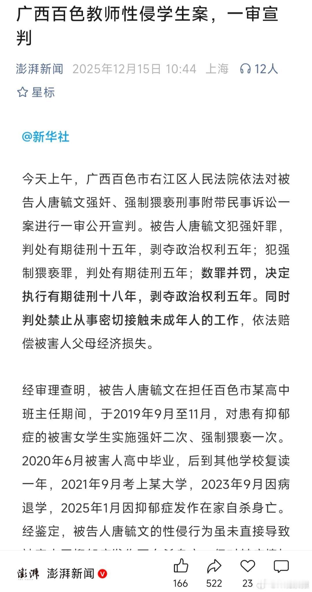广西高中教师性侵案一审宣判唐毓文案一审宣判:数罪并罚执行有期徒刑十八年,同时判处禁止从事密切接触未成年人的工作,依法赔偿被害人父母经济损失。