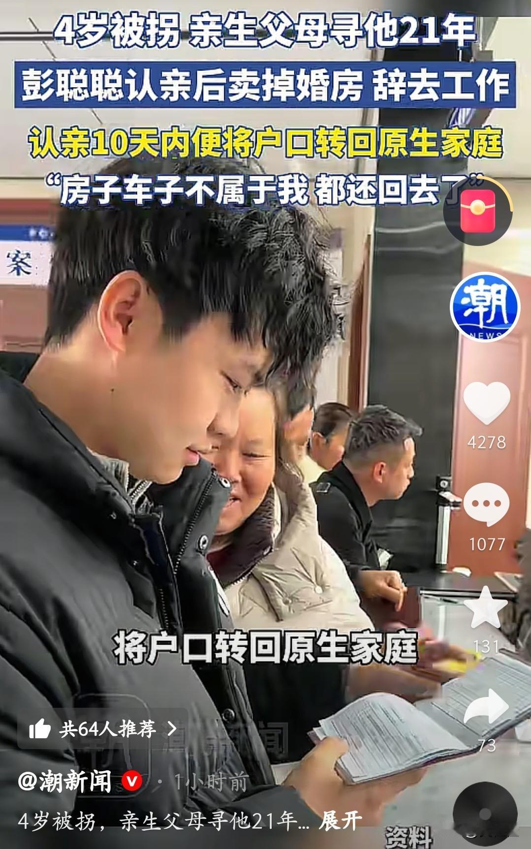 这是我见到的第一个认亲后马上把户口改回原生家庭的,就是彭聪聪。他4岁被拐,亲生父母找了他整整21年,这份执念想想都让人揪心。 认亲后他的做法更是让人意外,10天内就把户口转回去了,还直接卖掉婚房、辞了工作,说房子车子都不是自己的,全都还回去。能看出来他心里是真的想回到亲生父母身边,哪怕舍弃现有的生活也不在乎。 看着他和亲生父母合照时笑的样子,还有办户口时一家人凑在一起的画面,真的又心酸又感动。21年的分离,终于换来了团聚,他用最干脆的方式,奔向了找了他半辈子的爸妈。希望这家人往后的日子能一直团圆幸福,再也不分开。