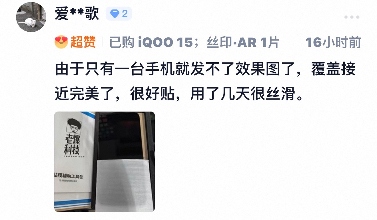 iQOO 15 丝印 AR 玻璃膜前置无开孔设计,一体性更好。顺滑好用,有抗反射,降低反光反射,屏幕内容显示更清晰。纯直屏轻松贴