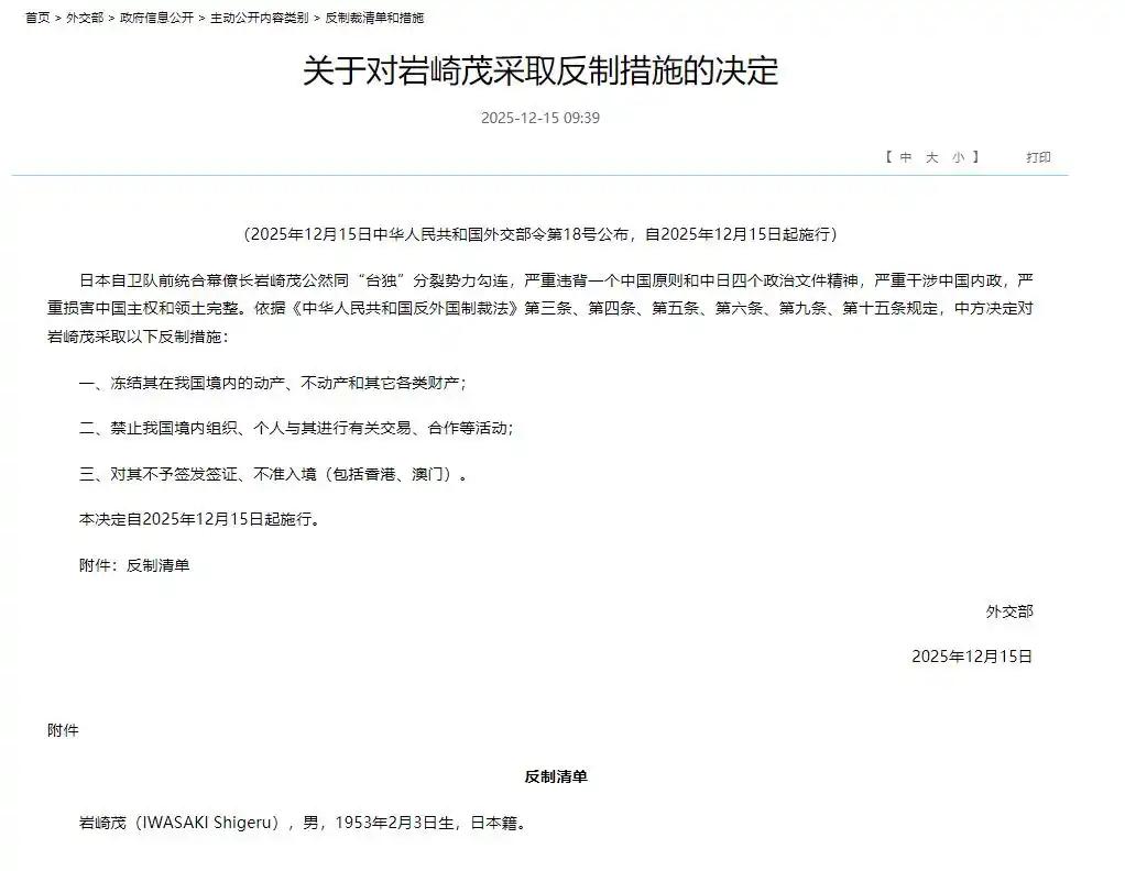 就在今天,中国对日本右翼发出了第一份制裁令:不准入境、冻结各类财产。   12月15日,高市早苗内阁还在做着中国会放过她的美梦。中国外交部罕见直接点名制裁了日本自卫队前幕僚长岩崎茂,这在中日关系史上还是头一次。   以往中国针对日本的反制措施,哪怕再严厉,大多也还是针对政府机构或者团体。这次直接对个人“下手”。   而且对象还是长期活跃在日本政治安全圈的重要人物,释放出的信号非常清晰:中国对严重干涉中国内政的日本右翼,不再止步于口头警告,而是动真格。   说到岩崎茂,外界对他的印象大多停留在自卫队高级将领、军事智库顾问这些头衔。但中国这次的制裁理由并不复杂:他和“台独”势力关系密切,甚至还担任过对方顾问。   这种行为,绝非寻常的学术交流或政策建言,而是明目张胆地挑衅一个中国原则,径直触及中国核心利益,是对中国主权与尊严的粗暴冒犯。   外交部发言人也在新闻发布会上明确指出,这些举动严重损害中国主权和领土完整,属于中国绝对不能容忍的红线。   制裁的内容很实在。岩崎茂在中国境内的资产被冻结,今后无论是公务还是私人事务,都不能再踏入中国,包括港澳在内。   更重要的是,所有中国组织和个人都被禁止与他有任何形式的合作与交易。这种“全方位封杀”不仅仅是象征动作,放在全球经济高度联系的今天,实质影响远不止于个人。   作为日本安全圈的重要人物,这等于让他在中国及相关区域彻底失去了影响力。事情发展到今天,表面看是中日之间又多了一层摩擦,实际上背后有更深的逻辑。   中日近来高层沟通基本处于暂停状态。日本新内阁高市早苗的强硬表态,让中国不再愿意与日本进行直接对话。中国外交部也明确表示,日方主动关上了沟通的大门。   就在这种大背景下,制裁岩崎茂的措施也被外界视为中国对日本右翼的警告,不容越界。中日之间的博弈工具远不止于外交发言和个人制裁。   中国手里还有不少反制“牌”,比如稀土、关税等领域的政策调整,都是可选项。反观日本方面,新领导层表现得非常焦虑,希望借助外部力量缓解压力。   比如高市早苗急于获得美国支持,甚至传出希望和美国前总统会面的消息。这背后其实说明,日本在对华政策上已经陷入被动,不得不依靠外部力量维稳。   与此同时,日本右翼势力趁机在国内推波助澜。近来日本社会网上流传着不少极端言论,如“宁可饿肚子,也不吃中国米”,这些话不仅获得许多日本网民支持。   还反映出部分日本政客有意煽动民间的对华敌意。通过制造情绪对立,右翼势力希望转移经济和社会问题压力,进一步巩固他们在国内的影响力。   这种做法对中日民间交流的冲击非常明显,甚至让部分日本社会出现了对中国的非理性排斥。历史上中日关系曾有过多次摩擦,但双方高层一直能保持一定的沟通机制,避免事态失控。   但目前这种沟通渠道几乎完全中断,意味着两国关系正经历一个敏感期。中国这次对个人实施精准制裁,其实在国际外交领域是非常常见的反制方式。   它既能明确表达立场,也能起到震慑作用,为今后的谈判和博弈留下空间。对于中国来说,维护国家主权和领土完整始终是底线。   无论是应对外部势力干预,还是面对地区热点问题,中国都展现出坚定立场和灵活手段。对日本右翼个人的制裁,也是对外传递中国立场不可动摇的信号。   与此同时,面对日本国内右翼势力煽动对立,中国更加重视舆论引导和民间交流的长期建设,用务实和理性的方式,稳步推进中日关系健康发展。   从更大视角来看,当前的中日局势不仅仅是两国之间的争端,也折射出全球地缘格局的新变化。日本右翼势力妄图借炒作对华强硬路线,攀附外部势力以重塑自身战略角色。   而中国则用实际行动回应挑战,展示了作为负责任大国的担当和底气。未来两国如何化解摩擦、恢复有效沟通,还需要更多智慧和耐心。   现实情况是,只有以合作为基础,才能真正实现地区稳定和共同发展。 MCN双量进阶计划 参考来源:中方:对日本自卫队前统合幕僚长岩崎茂采取反制措施——新京报2025-12-15