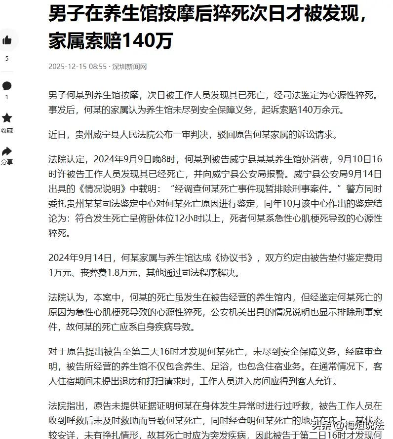 近日,贵州威宁发生一起令人唏嘘的事件。一名男子前往养生馆按摩并留宿,直到次日下午4点才被工作人员发现已经离世。警方调查排除刑事案件可能,尸检鉴定结果显示男子系心源性猝死,死亡时间已超过12小时。 事发后,男子家属对养生馆提出质疑,认为其未能及时发现男子身体异常并进行有效救治,导致悲剧发生,遂提起诉讼,并索赔高达140万元。案件一经公开,立刻引发社会热议:养生馆作为服务场所,应承担多大责任?面对突发健康状况,商家到底应该如何应对? 法院审理后认为,养生馆虽负有一定的安全保障义务,但猝死属于突发性心源性事件,难以通过常规服务完全预防。此外,鉴于男子当日无明显异常表现,养生馆未能及时发现亦属情理之中,责任有限。最终判决驳回家属大部分赔偿请求,法院判决养生馆承担部分赔偿责任。 这起案件引发了我们对公共服务场所安全管理的更深入思考。生命无价,突发疾患时刻可能发生在任何人身上,无论是消费者还是经营者,都需要更强的安全意识与责任担当。养生馆等服务业者应加强设施管理和紧急救援培训,提高遇紧急状况的反应能力;同时,消费者也应增强自身健康风险认识,合理安排养生疗程。 网友对此案众说纷纭,有人为养生馆“无可奈何”的处境叫屈,也有网友同情家属的痛失之情,更多人呼吁完善行业规范,设立紧急医疗救护预案,守护每一个生命的安全。 这场悲剧让我们看到了生命的脆弱,也提醒了社会各界——安全责任不应只停留在口头,制度和预防才是真正的生命守护神。唯有共建更加安全、负责的服务环境,才能让每一份关爱都落到实处。 中年猝死 心源性猝死