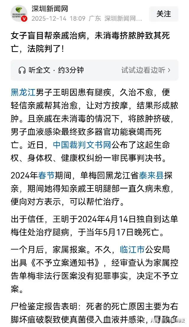 近日,吉林临江发生一起令人痛心的事件:一名女子回老家探亲时,了解到亲戚有腿疾,主动表示“自己能治”。却因缺乏正规医疗手段,仅凭推拿揉搓,竟在亲戚腿上出现了大脓肿。更令人震惊的是,女子在未经消毒的情况下直接挤破脓肿,导致亲戚严重血液感染,最终因多器官功能衰竭不幸离世。 这起悲剧让人唏嘘,也让我们不得不深刻反思:当“信任”与“医学”交叠,盲目自救的风险究竟有多大?亲情本该是最温暖的避风港,但一时的错误举措却将生命推向深渊。 事情曝光后,亲属不仅报警,还依法提起诉讼,要求法律给出公正判决和合理赔偿。法律专家指出,未经专业医疗许可的治疗行为,一旦造成损害,依照相关法律应承担相应责任。同时,这也警示广大群众:医疗安全不可忽视,非专业操作的“偏方”可能带来难以挽回的后果。 从更深层看,这场悲剧背后折射出农村医疗资源匮乏,和大众对正规医疗认知的不足。许多家庭因条件限制,宁愿选择熟人“自疗”也不愿轻易去医院,这种深层次问题亟需社会各界给予关注和改善。 网友纷纷表示痛心:“救人一命胜造七级浮屠,可惜一念之差毁了一生。”“亲情不是万能,专业医疗才是保障。”“呼吁大家遇病及时正规治疗,别因盲目自救酿成悲剧。” 这是一堂沉痛的生命教育课,提醒每个人:善意和爱心固然重要,但科学和规范的医疗才是护佑生命的坚实基石。只有理性面对疾病,尊重专业,才能为自己和家人撑起安全的保护伞。 亲人得病 就医后身亡