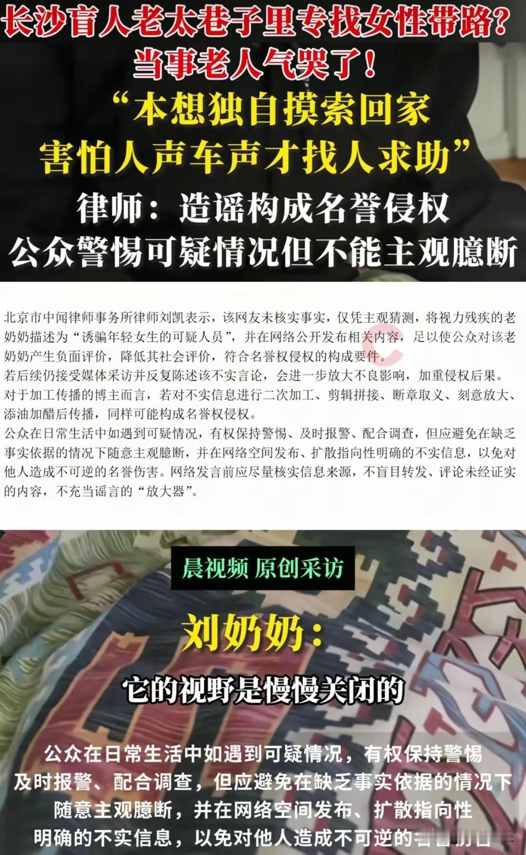 长沙街头一场求助风波,反转来得太让人揪心!73岁盲人奶奶街头求带路,竟被质疑是诱骗女性的人贩,全网唾骂之下,老人委屈到彻夜难眠,真相曝光后无数人沉默了。 12月10号晚上,长沙五一广场附近,一名女生遇到拄着盲杖的刘奶奶求助带路。女生拒绝后,发现老人似乎专挑女性求助,还当众摆弄手机,联想到网上的诱骗案例,她立刻拍视频提醒大家警惕,视频一经发布瞬间引爆网络。网友们顺着“专找女生”“会用手机”这两个疑点,纷纷指责老人是“伪装盲人的人贩”,甚至有博主直接点名怒斥,让这场误会彻底升级成网络暴力。 可谁能想到,被全网唾骂的老人,竟是一位实打实的视力一级残疾人!12月13号记者上门采访时,刘奶奶当场拿出残疾证,崩溃哭诉自己太冤枉。原来她患有遗传性眼疾,已经完全失明十几年,当天保姆请假,她独自乘公交回家,下车后被巷口的车流人声吓慌,只能靠听声音辨认路人,听到女生说话才上前求助,根本不是刻意挑人。而大家质疑的“看手机”,其实是视障人士必备的读屏功能,她靠语音反馈操作手机,全程都是“听”而非“看”。 社区工作人员也证实,刘奶奶家住附近的退休教师公寓,家里几代都是教师,平时邻里街坊见她独自出行,都会主动搀扶,口碑特别好。直到按摩店熟人告知,她才知道自己上了热搜,还被冠上“人贩”骂名,气得连续几晚失眠,一辈子堂堂正正的她,怎么也想不到好心求助会落得这般下场。 12月14号凌晨,发布视频的女生终于发布道歉视频,承认自己对盲人生活了解片面,无意伤害老人,为带来的困扰诚恳致歉。这场闹剧总算迎来收尾,但留给我们的思考远没结束。女生的安全警惕值得理解,可未经核实就发布指向性视频,无疑给无辜老人带来了毁灭性伤害。 网络时代,一条随口的猜测、一段断章取义的视频,就能轻易摧毁一个人的名誉。多一点对特殊群体的了解,少一点主观臆断;多一份理性核实,少一次盲目转发,才不会让善意被猜忌裹挟,让无辜者沦为网暴的受害者。盲人老太被质疑诱骗女性 痛哭求还清白