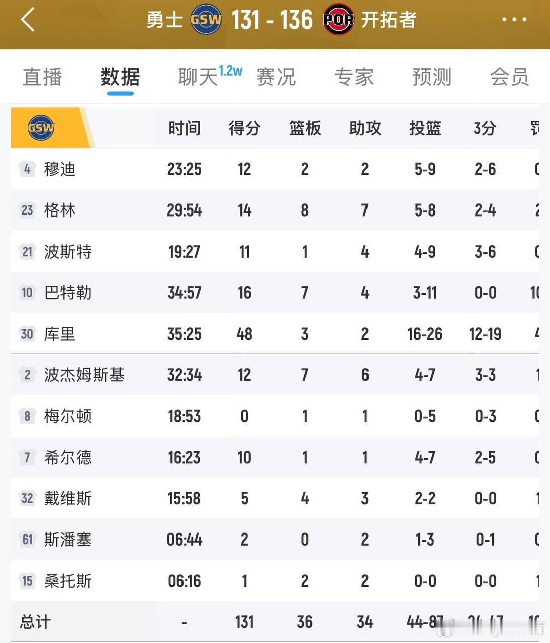 除了库里的48分其他人没有得分20+的,开拓者两人35+,一人26+,这赛季连输三场开拓者。