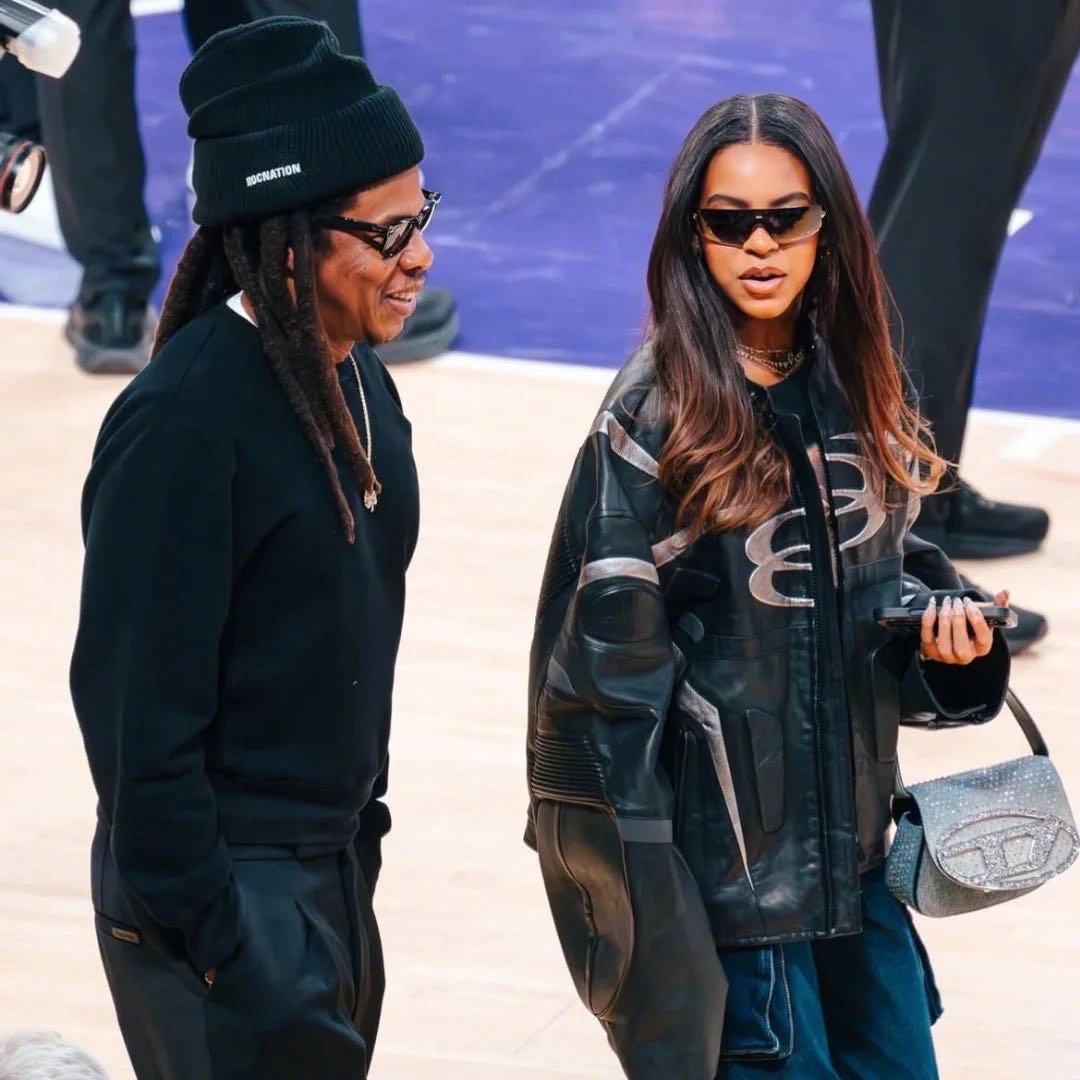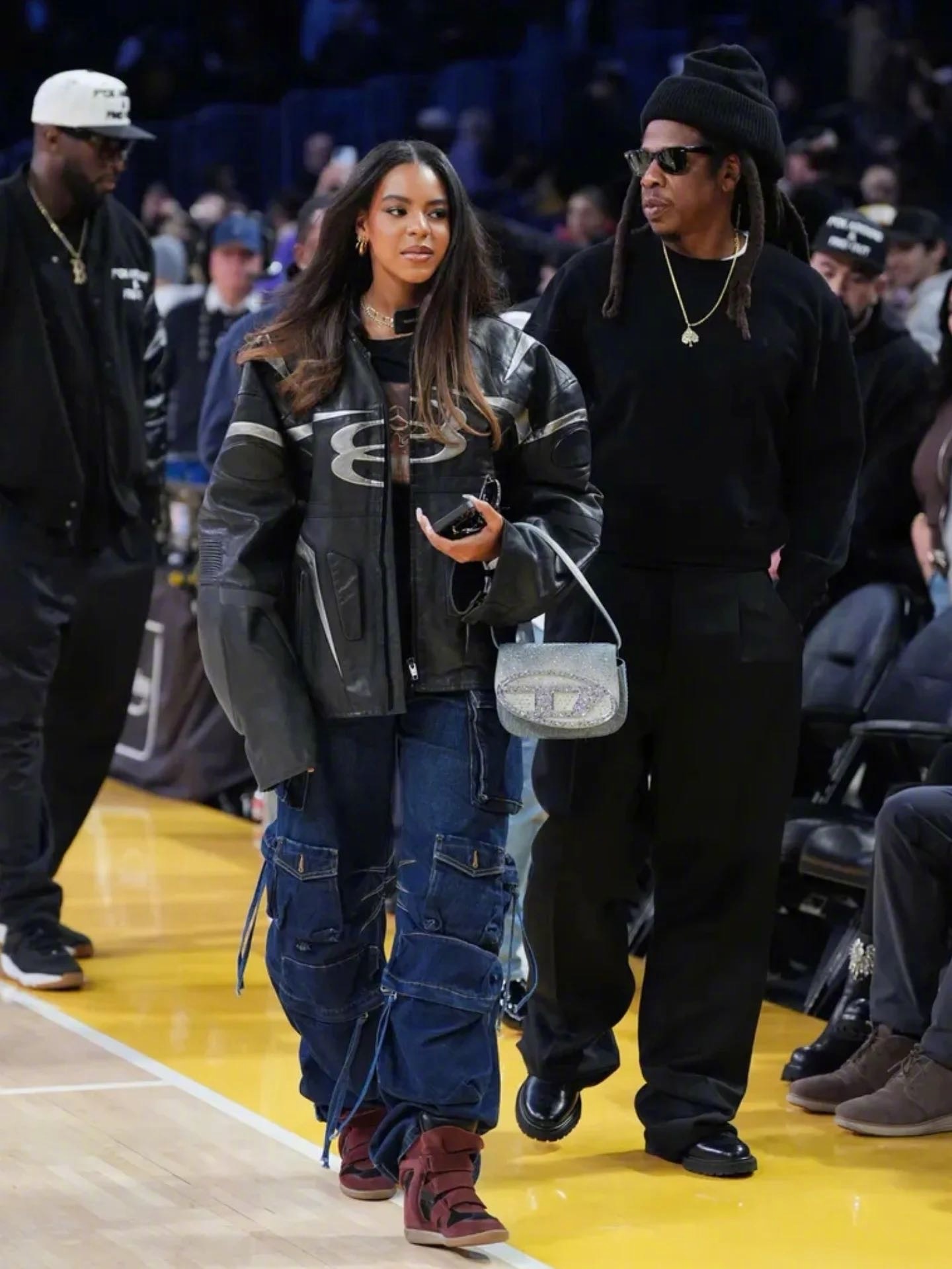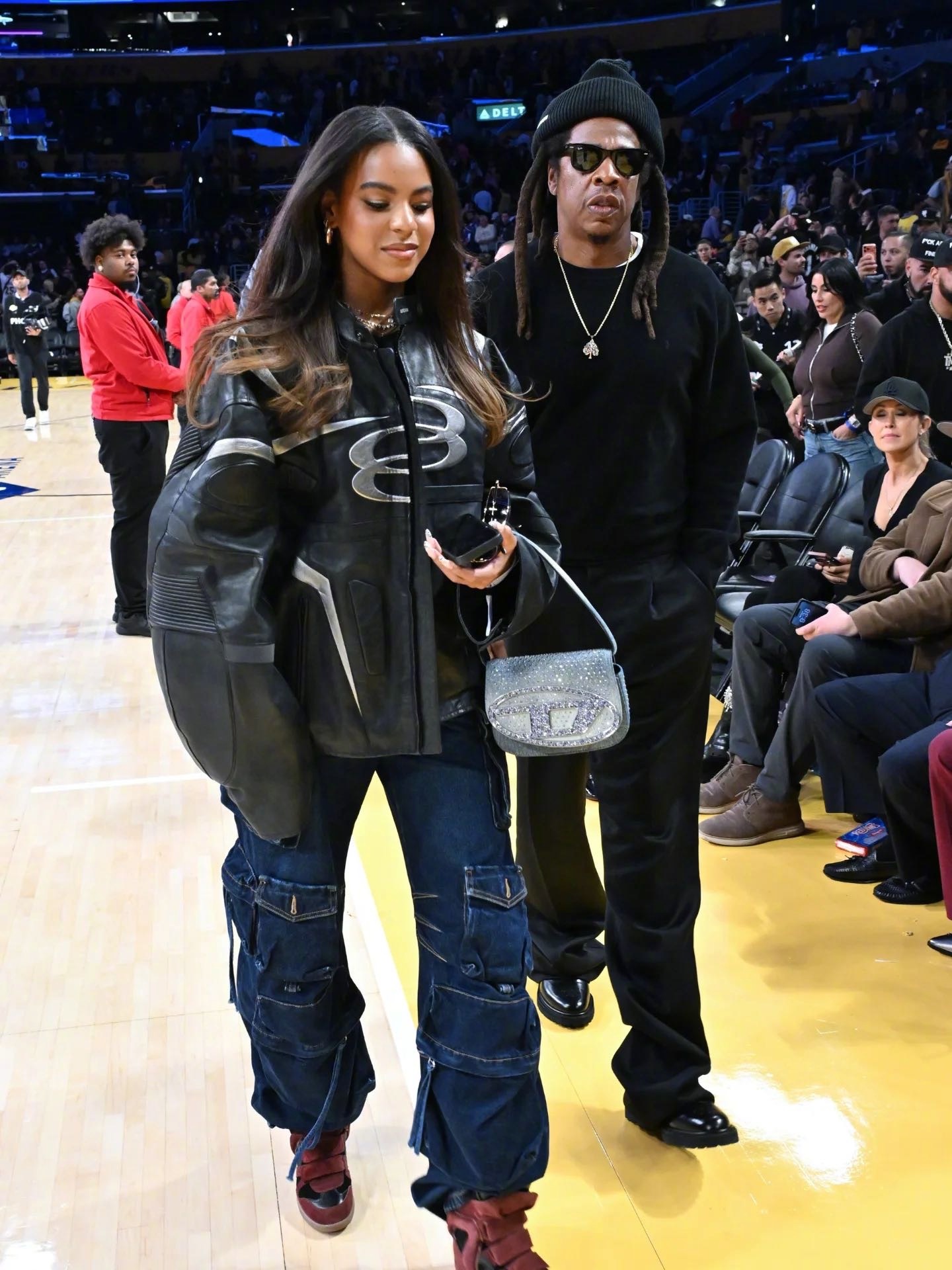 13岁的布鲁·艾薇·卡特(Blue Ivy Carter)和老父亲Jay-Z 现身洛杉矶观战湖人比赛。老爸秒变跟班!蓝厅长身穿巴黎世家皮衣,手拎DIESEL包包,酷范儿十足。米拉服饰解析