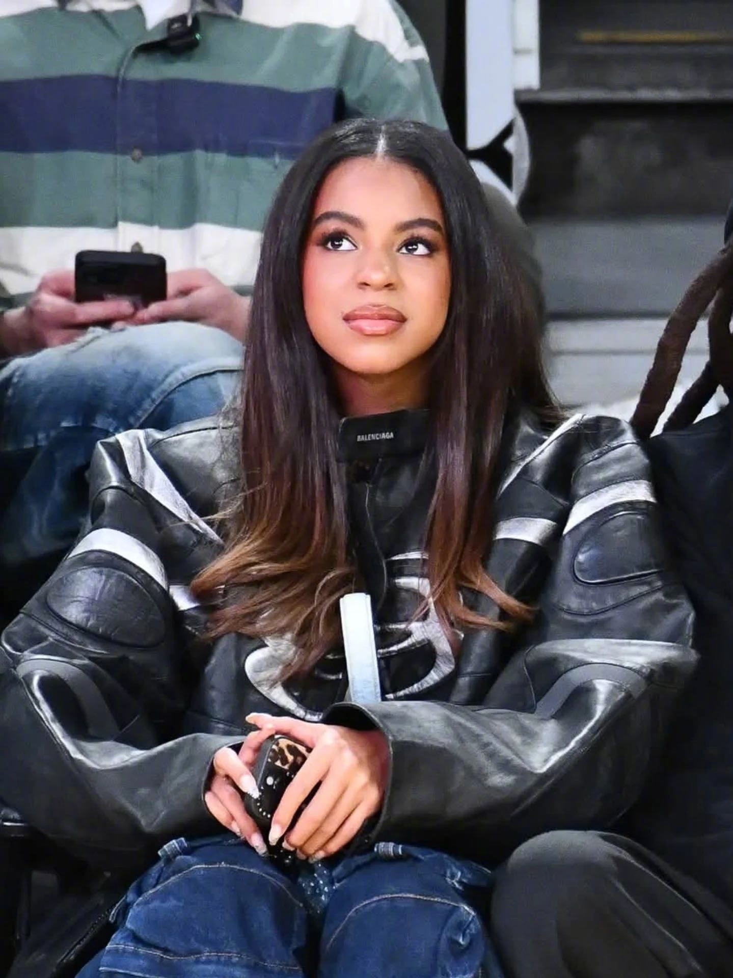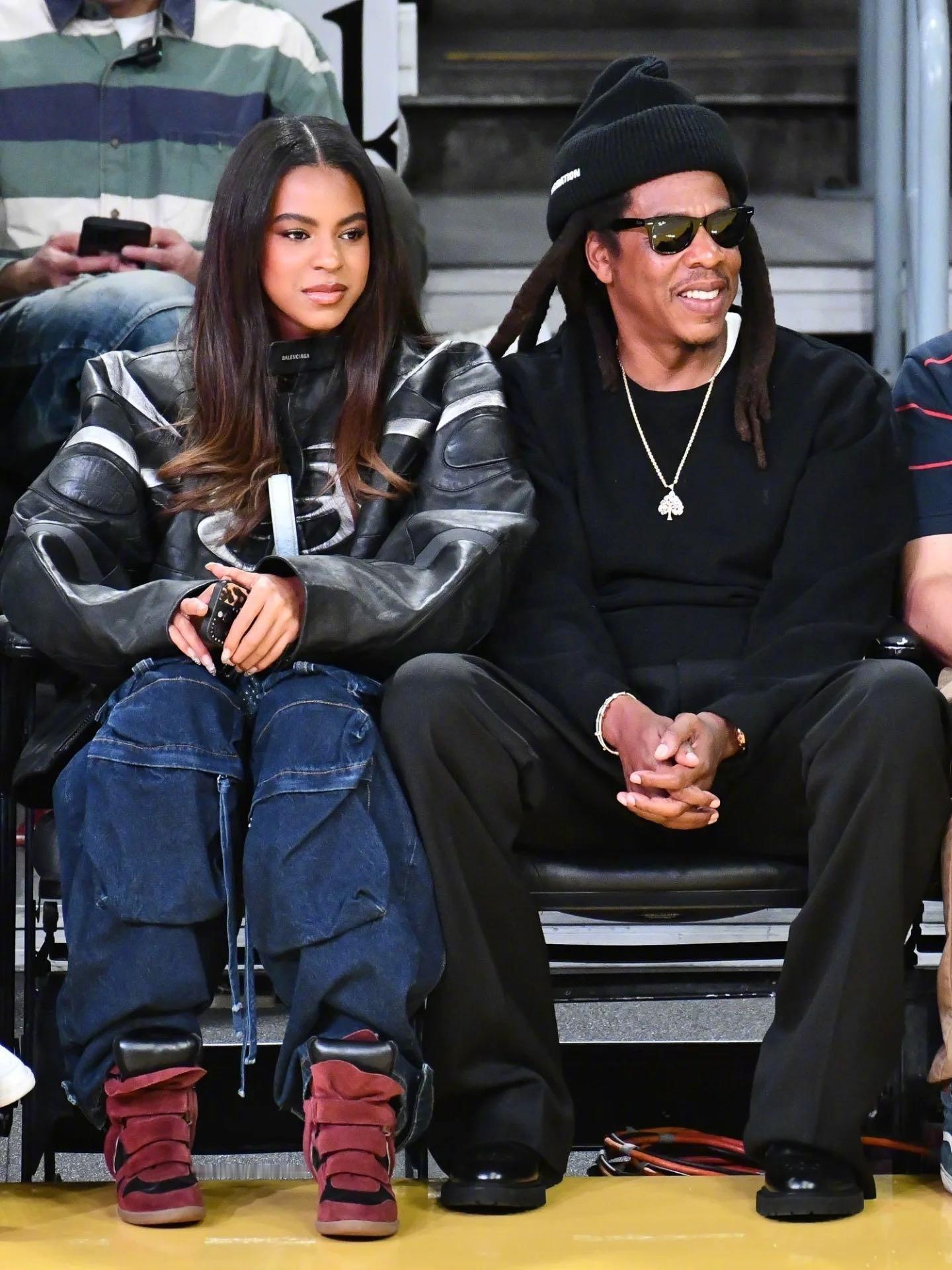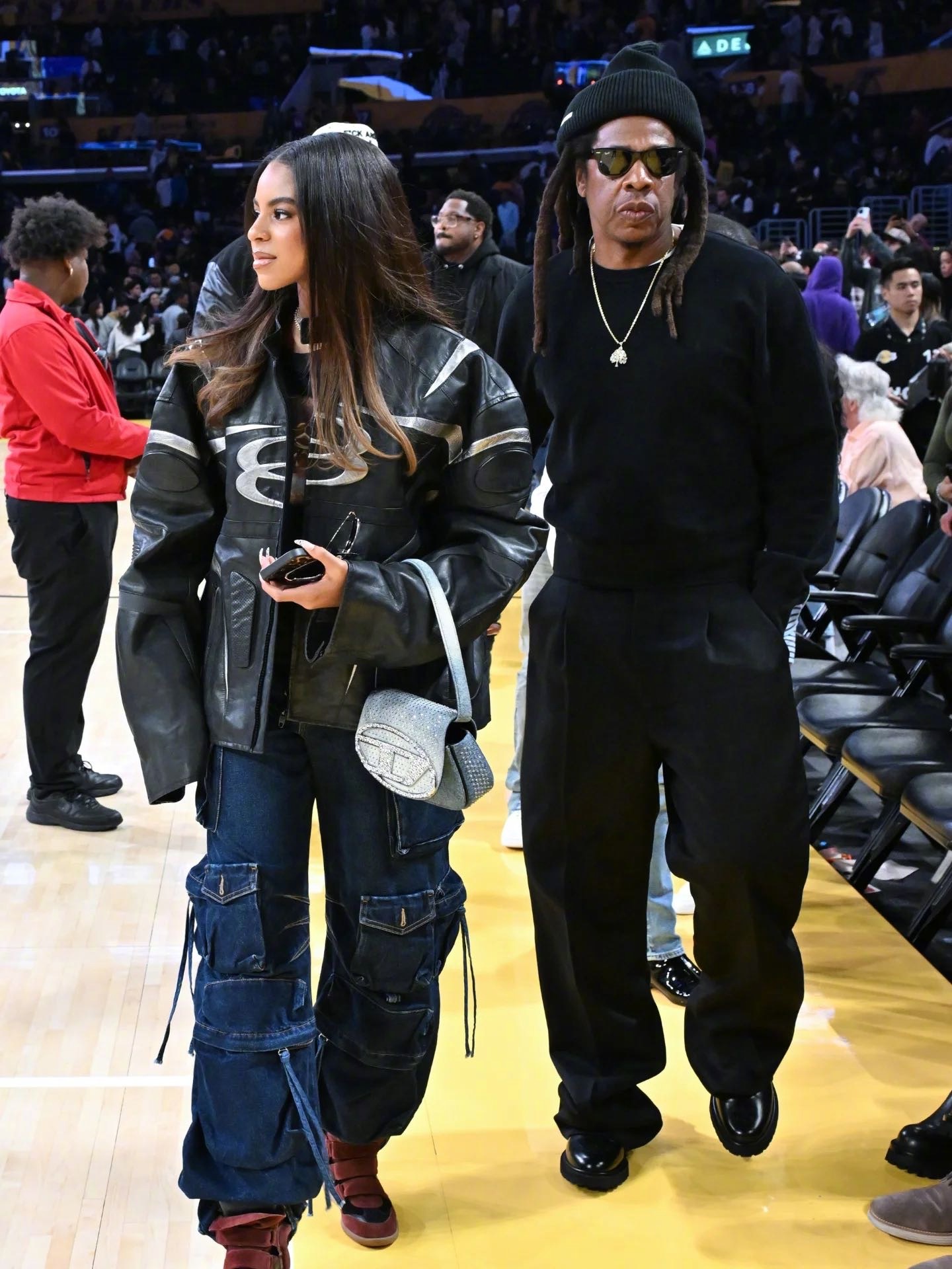 13岁的布鲁·艾薇·卡特(Blue Ivy Carter)和老父亲Jay-Z 现身洛杉矶观战湖人比赛。老爸秒变跟班!蓝厅长身穿巴黎世家皮衣,手拎DIESEL包包,酷范儿十足。米拉服饰解析