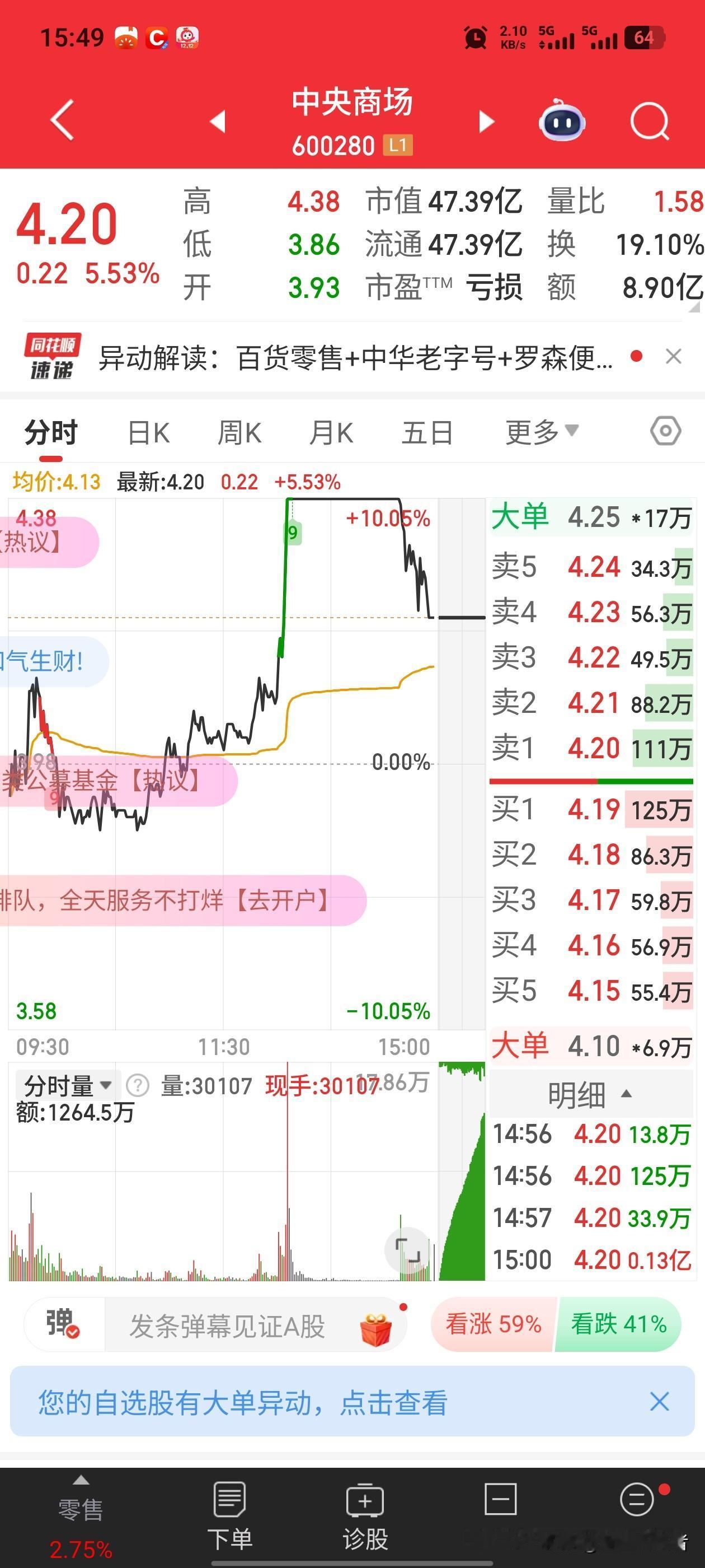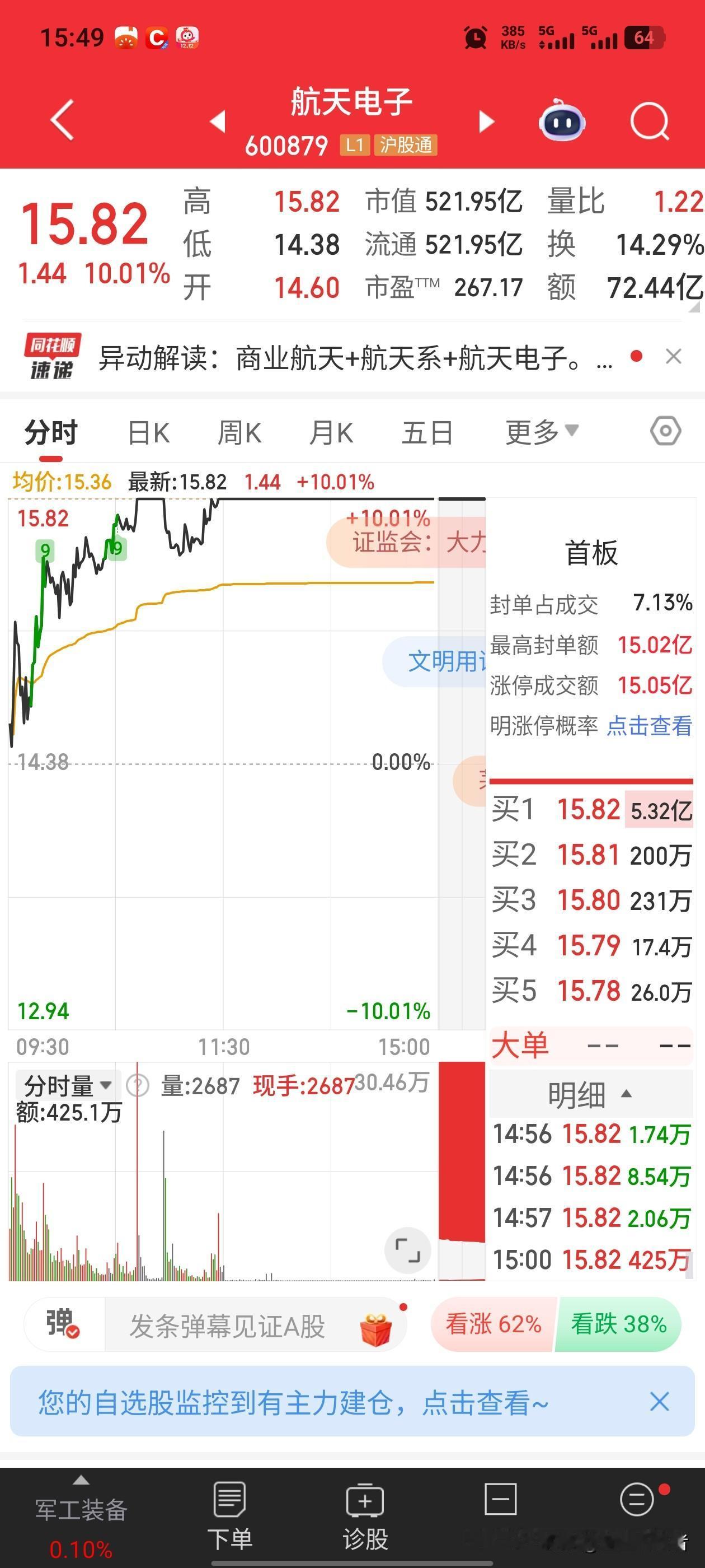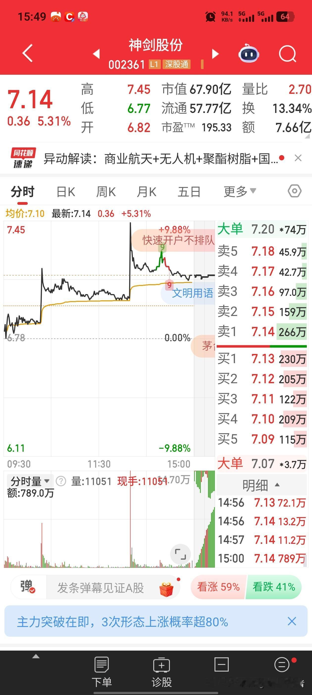 消费板块大幅上涨📈,激动啊!追进中央商场,一度封顶。可以安稳上班了!收盘一看,封单不见了,你说红旗连锁都封住了。你咋这样,给你机会不中用啊!明天会不会给我吃大面呢? 神剑今天反复拉伸回落,我就是不出,继续熬。 航天电子今天也是排队轮到了,终于涨停板了。不过仓位大幅缩水了。可惜可惜[我想静静]