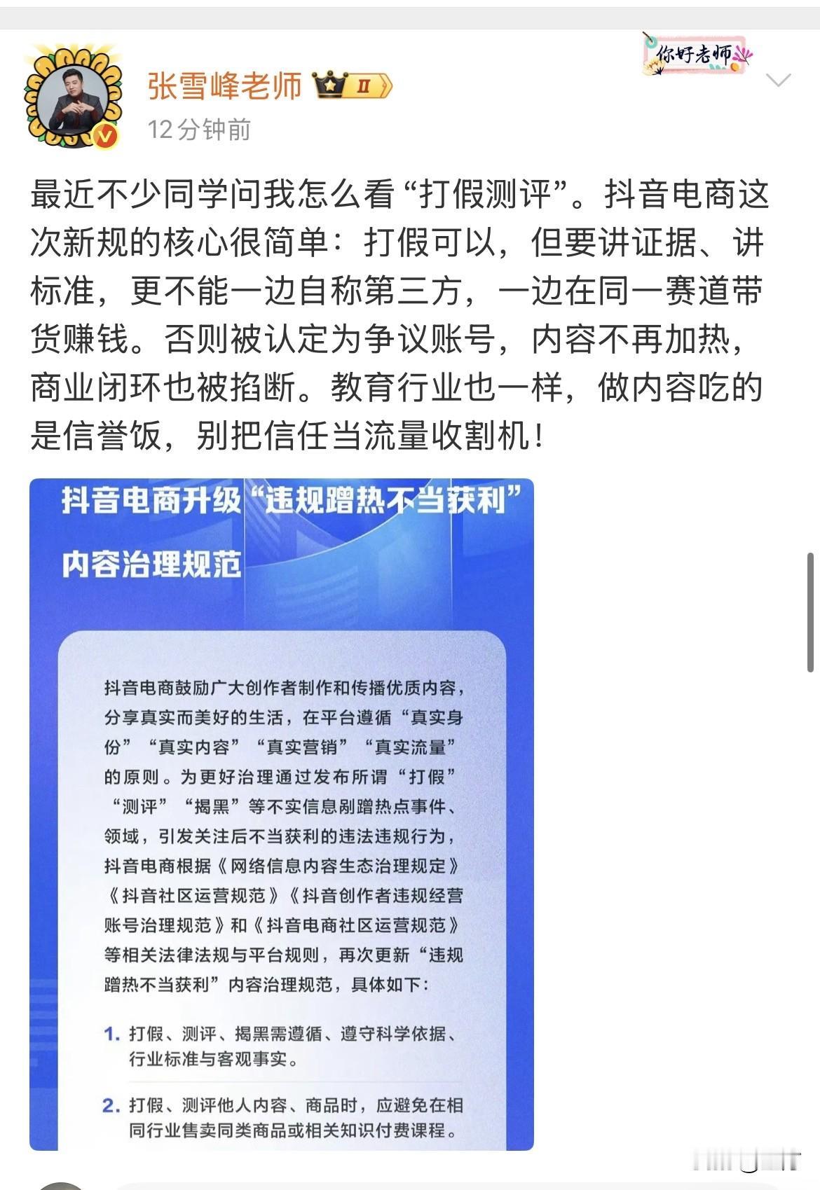张雪峰谈“打假测评” 就是刚才,张雪峰专门谈到了,他如何来看待“打假测评”这个赛道,因为有很多博主专门在做这个事情,无论是老百姓衣食住行用的产品,还是他所从事的教育行业,都有人在专门做这个事儿。 不过现在的问题是,这些人一边在测评一边在打架,同时一边在吃流量,也就是说这些人是在依赖做这个事情去获得流量的,从中赚钱的,因此在张雪峰看来,如果这些账号在通过这种方式获取收益的话,那么就不能确定他们做这个事情的出发点,因此在这个过程中是否就会存在真正的客观和第三方。 所以他认为做这种行业,其实就是让粉丝和受众信任他,但是如果把这种信任变成他赚钱的工具的话,这样还是不妥当的。 所以最终他把平台官方,关于这方面的最新规定也附在后面了,可能在他的眼睛里面,至少他没有这样做,他也希望同行们不要这样做。