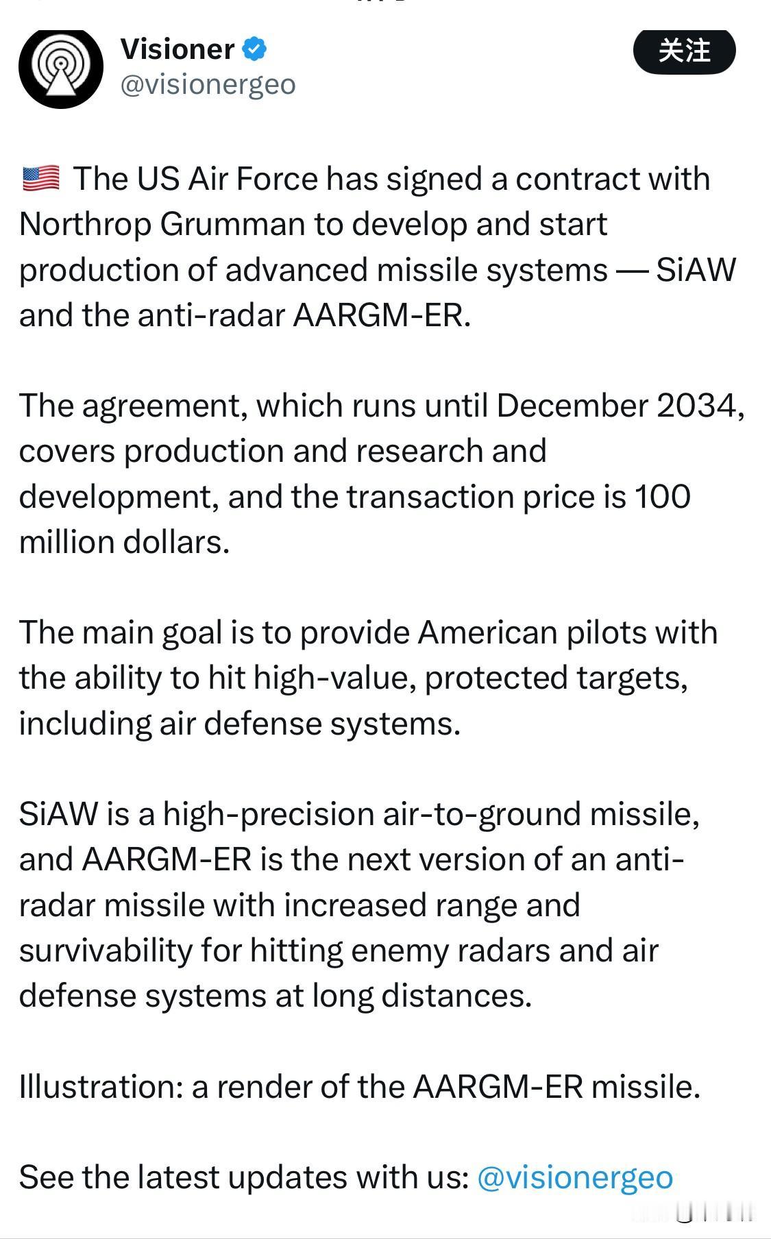 美国空军与诺斯罗普·格鲁曼公司签署了一份合同,开发并开始生产先进的导弹系统——S
