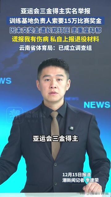 亚运会三金功臣,居然被欺负到实名举报? 刚为国争光拿了三金,转头就被训练基地负责人要15万比赛奖金。 没交这钱,就遭长期打压,谎报有伤病,私自上报退役材料。 现在被逼成重度抑郁,只能靠举报讨公道。 有人说这负责人胆也太肥了,敢动亚运会功臣的钱 也有人说运动员太弱,怎么不早反抗 我真的心疼到掉眼泪!拿命拼来的荣誉,是给国家争脸的,不该成了某些人的摇钱树! 运动员不是工具啊,他们的伤、他们的苦,难道就该被当成空气? 大家怎么看这种有功反被坑的事?运动员的付出,不该被权力滥用糟蹋吧?