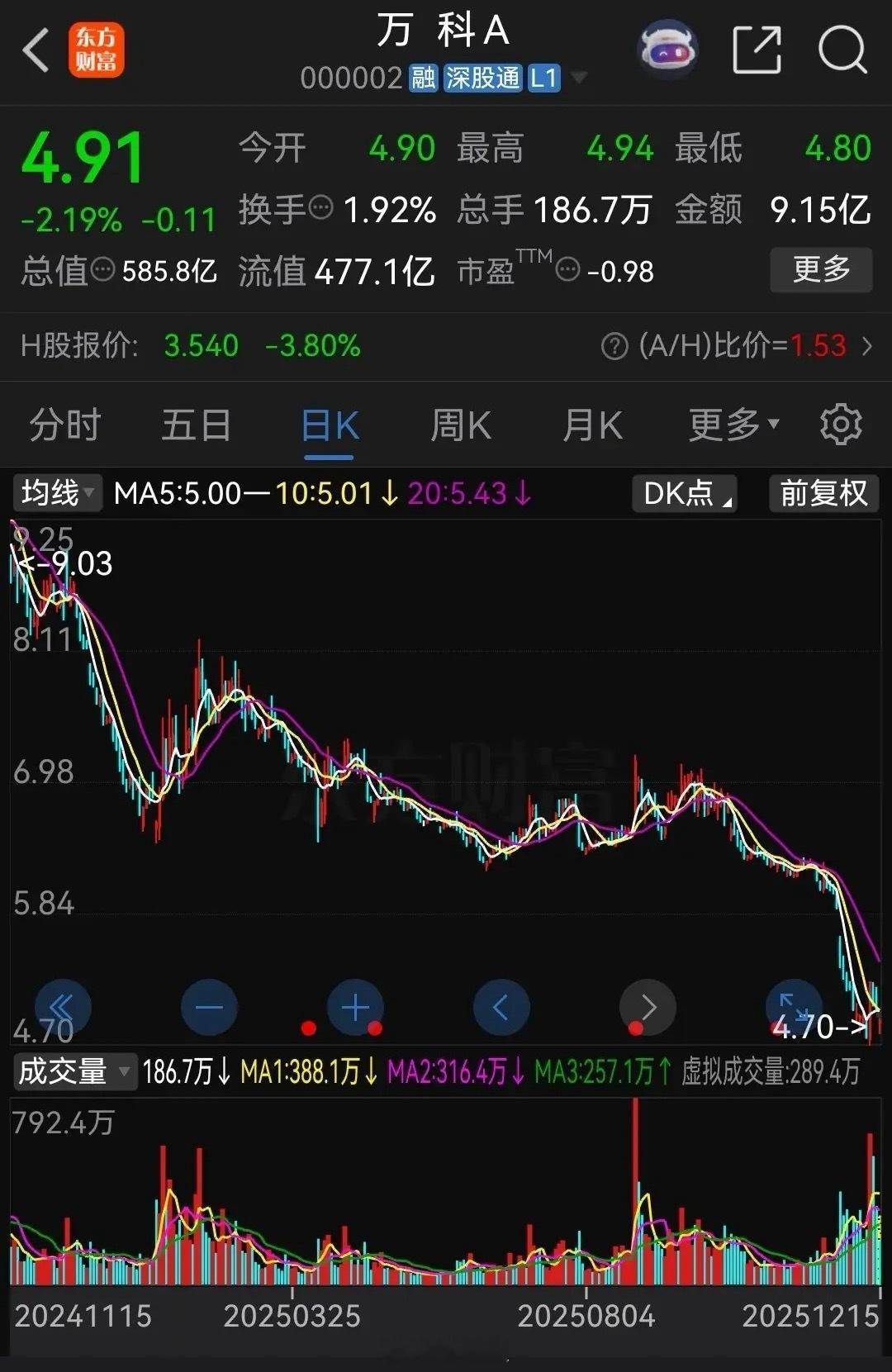 万科的股价上周一个涨停后,又快跌回了原形!周末,万科三个展期议案全部被否,均未获得通过。受次利空消息,今天大幅低开,然后震荡盘整,盘中最低跌到了4.80元,这个价比上周的最低价只高了一毛钱,又快跌回了原形,截至上午收盘股价报收于4.91元,下跌2.19%。万科目前已经到了生死存亡的关键时刻,接下来如果再没有实质性进展,这意味着万科将彻底违约,后果不敢想象。现在回头看,前几年二三十元进场,做价值投资,把万科当做宝贝一样的股民真是勇士啊!