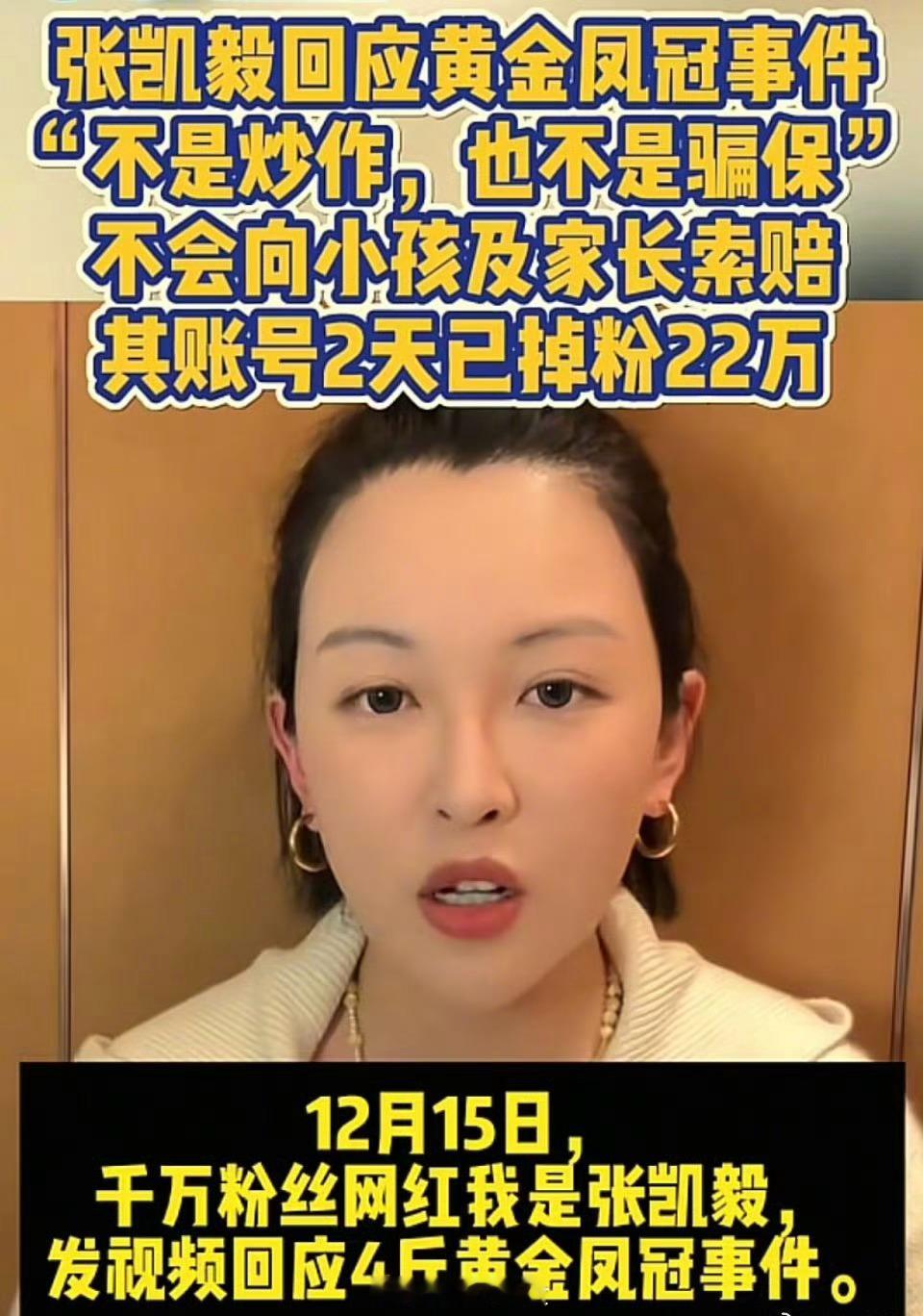 黄金凤冠事件后网红张凯毅账号掉粉超20万,发视频回应:不会向小孩及家长索赔,不是炒作也不是骗保