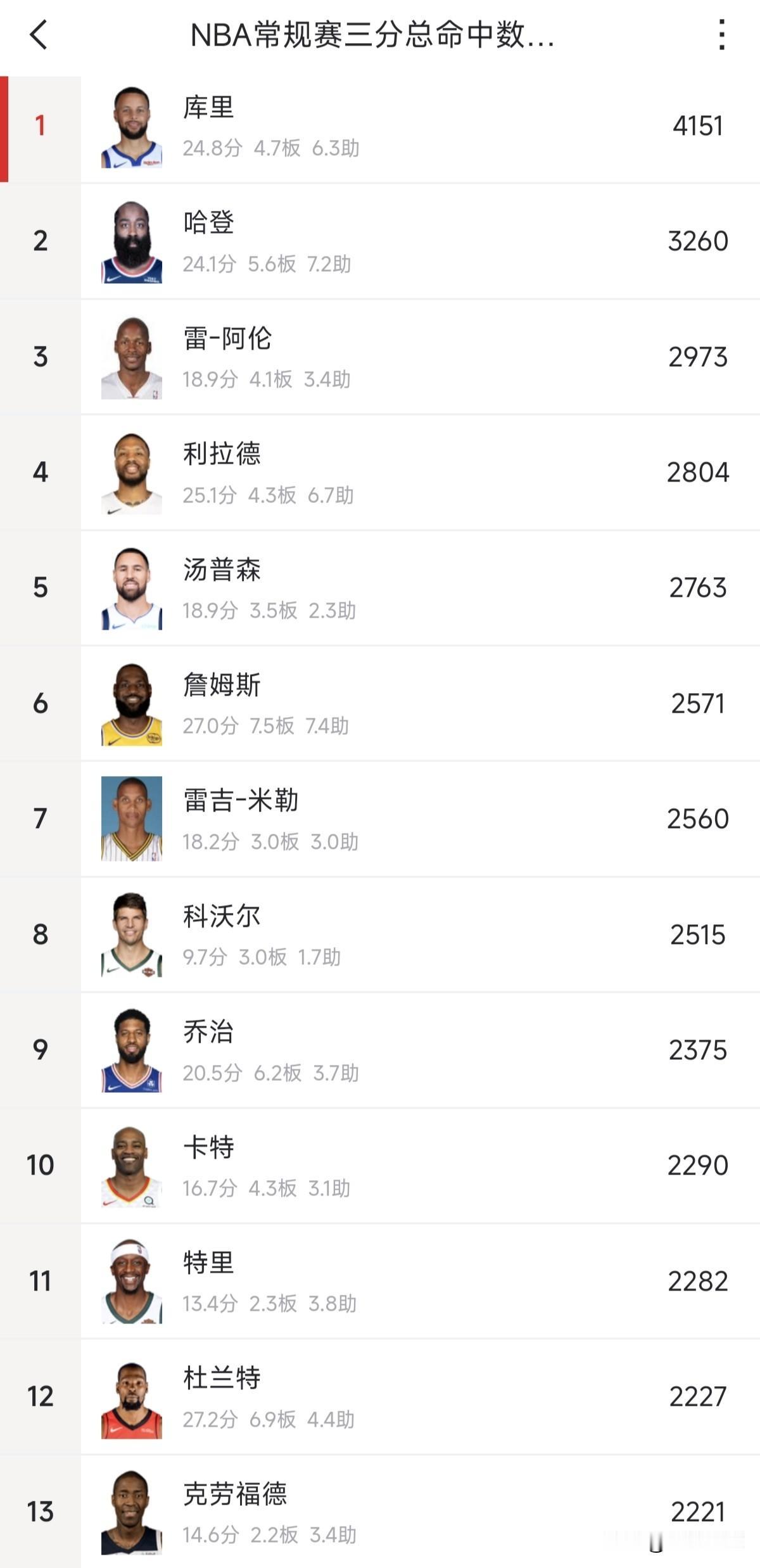 詹姆斯如果下赛季退役,他的三分球能不能超过曾经的三分第一人雷阿伦呢? 雷阿伦三分总数是2973个目前排名历史第三,后面肯定会被利拉德和汤普森超过,那么现在排名第六的詹姆斯有多大概率超过呢? 现在詹姆斯有2571个,和雷阿伦相差402个,本赛季和下赛季想要402个还是有很大难度,对于库里来说这个很容易。 目前杜兰特有2227个排名历史第12位,和詹姆斯相差347个,杜兰特想超过詹姆斯也有一定难度,但还是有机会的。