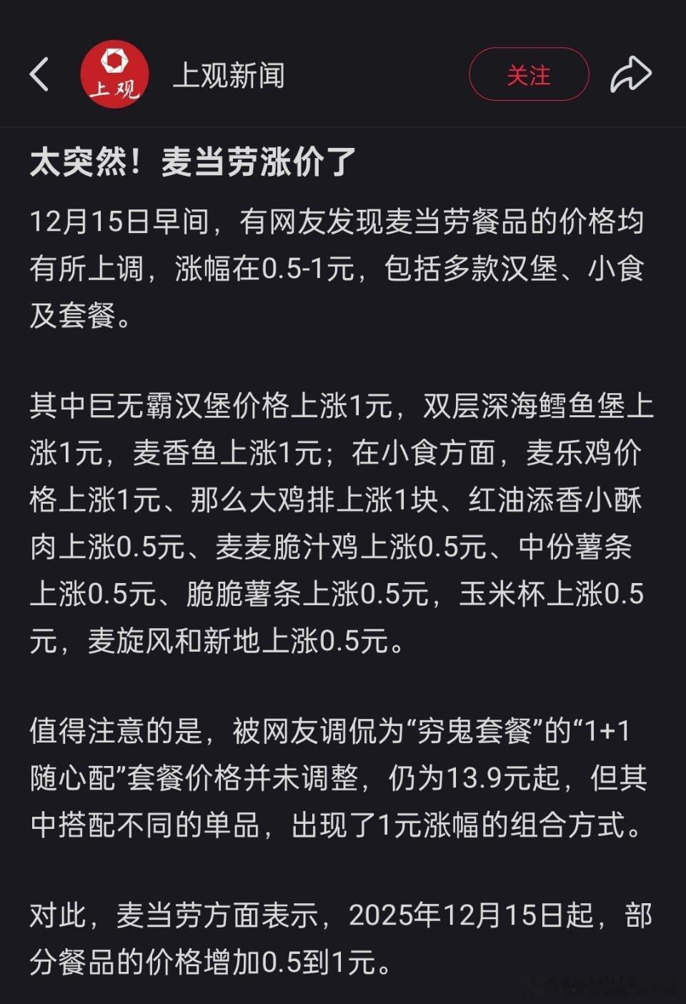 麦当劳涨价🔻真没想到啊,麦当劳涨价了,穷鬼套餐以后要花13.9或14.9,你还会吃吗?
