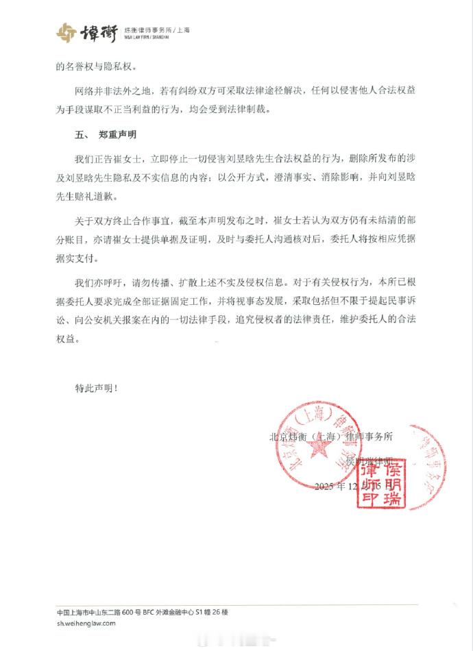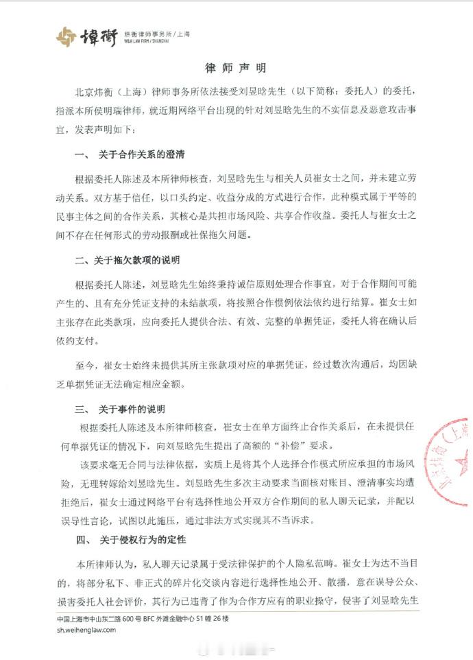 刘昱晗发律师声明刘昱晗否认拖欠工资 此前被工作室控诉的演员刘昱晗发布律师声明回应,“委托人与崔女士之间不存在任何形式的劳动报酬或社保拖欠问题。”