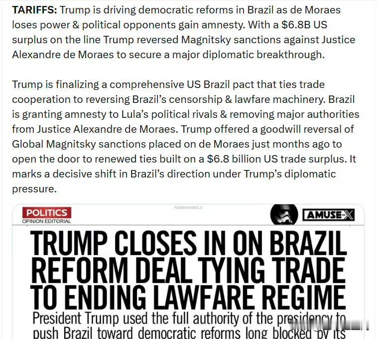 特朗普正在推动巴西的民主改革,随着莫赖斯权力被削弱、政冶对手获得特赦,局势正在发生变化。鉴于美国对巴西68亿美元的贸易顺差攸关重大,特朗普为促成一次重要的外交突破,决定撤销对大法官亚历山大·德·莫赖斯实施的《马格尼茨基法》制裁。 特朗普正在敲定一项全面的美巴协议,将贸易合作与撤销巴西的婶查制度及“以司F为武器”的机制挂钩。巴西方面正向卢拉的政冶对手提供特赦,并剥夺大法官亚历山大·德·莫赖斯的多项关键权力。作为善意举措,特朗普提出撤销数月前对莫赖斯实施的《全球马格尼茨基法》制裁,为在68亿美元美国贸易顺差基础上重建双边关系打开大门。这标志着在特朗普外交压力之下,巴西发展方向出现了决定性的转变。