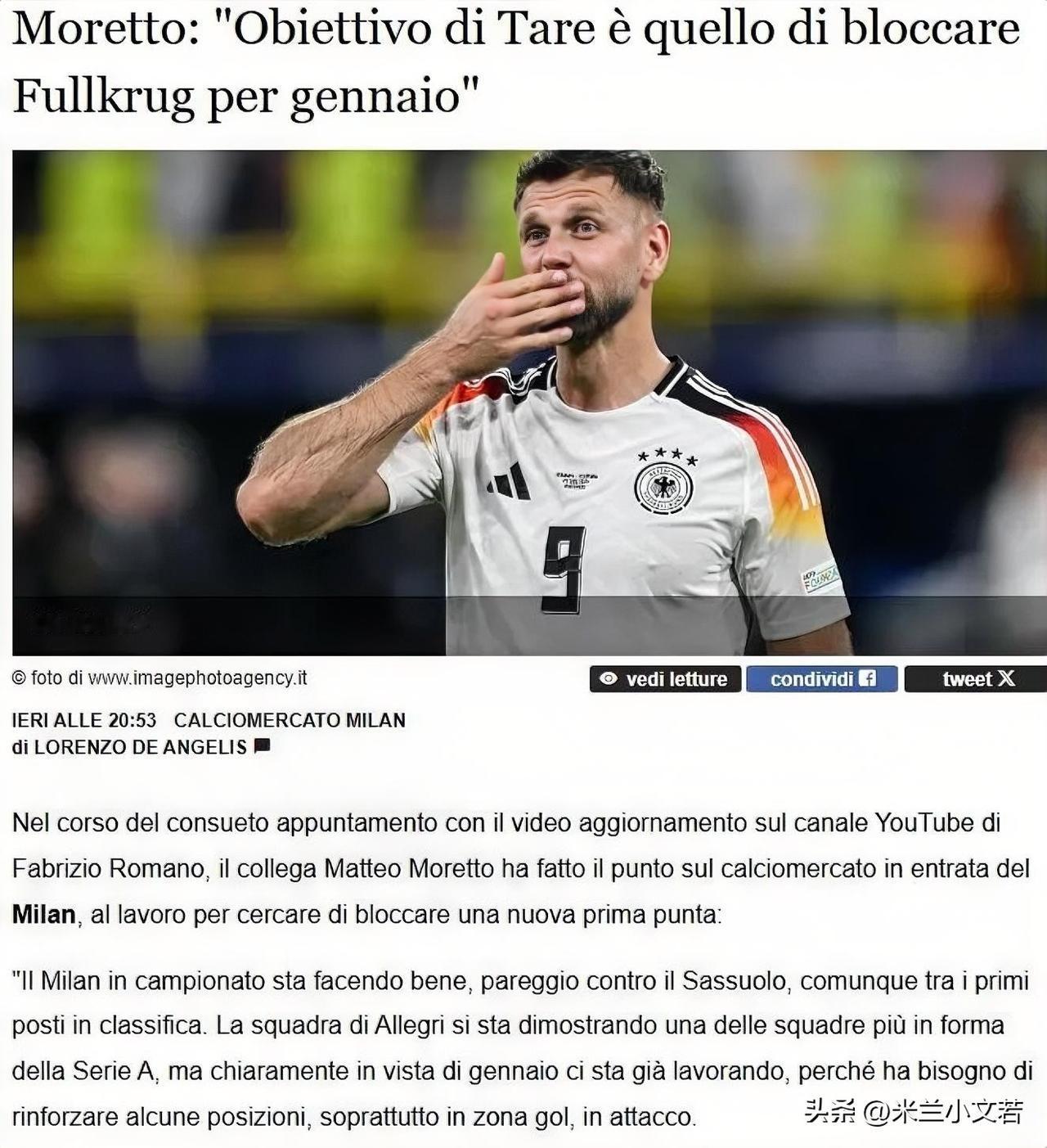 菲尔克鲁格!莫雷托消息称米兰体育经理锋线目标球员就是德国前锋菲尔克鲁格,塔雷表示米兰锋线目标球员菲尔克鲁格一直都是最重要的存在,米兰和西汉姆联之间,以及米兰和菲尔克鲁格的随行人员之间,预计将很快产生直接接触。 莫雷托表示塔雷的目标是尽快签下菲尔克鲁格,努力确保已经掌握了一名无论从特点还是成本来看都可能是目前对米兰最实用、最适合的前锋。同时罗马诺也证实了莫雷托消息的真实性,罗马诺同样指出米兰在锋线第一目标球员为德国前锋菲尔克鲁格,他曾经是米兰的锋线目标球员,说的是2024夏季窗口,但最后米兰选择了亚伯拉罕,现在米兰不会再次错失菲尔克鲁格。 个人想法,只是个人想法,在球员伤病或者低迷时候抄底,红鸟集团和弗拉尼貌似是一种转会策略,表面上看账算得精确,关键是这样的操作就不可能保证下限,就像美队和恩昆库,无疑一个赌赢了,一个赌输了,经济体育的经营可以冒险,但不能每一笔都这么搞,之前罗马诺也说过相同的问题,不是每个球员都是普利西奇,米兰不能每次都购买有风险性的球员。