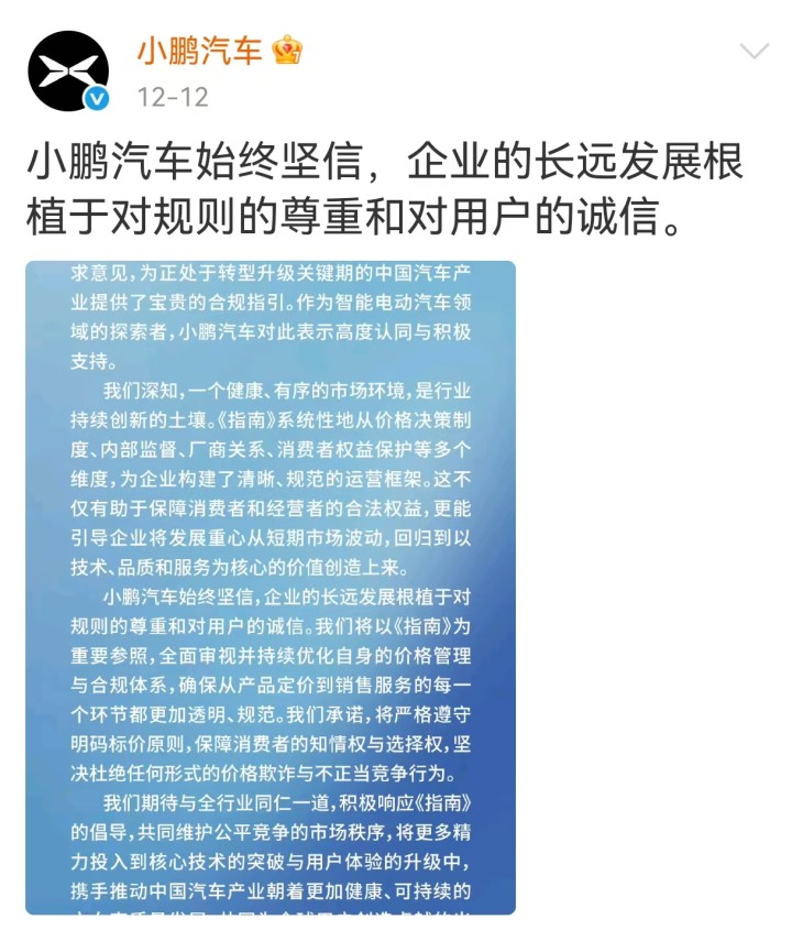 小鹏汽车发文,将以《指南》为重要参照,全面审视并持续优化自身的价格管理与合规体系,确保从产品定价到销售服务的每一个环节都更加透明、规范。小鹏汽车承诺,将严格遵守明码标价原则,保障消费者的知情权与选择权,坚决杜绝任何形式的价格欺诈与不正当竞争行为。