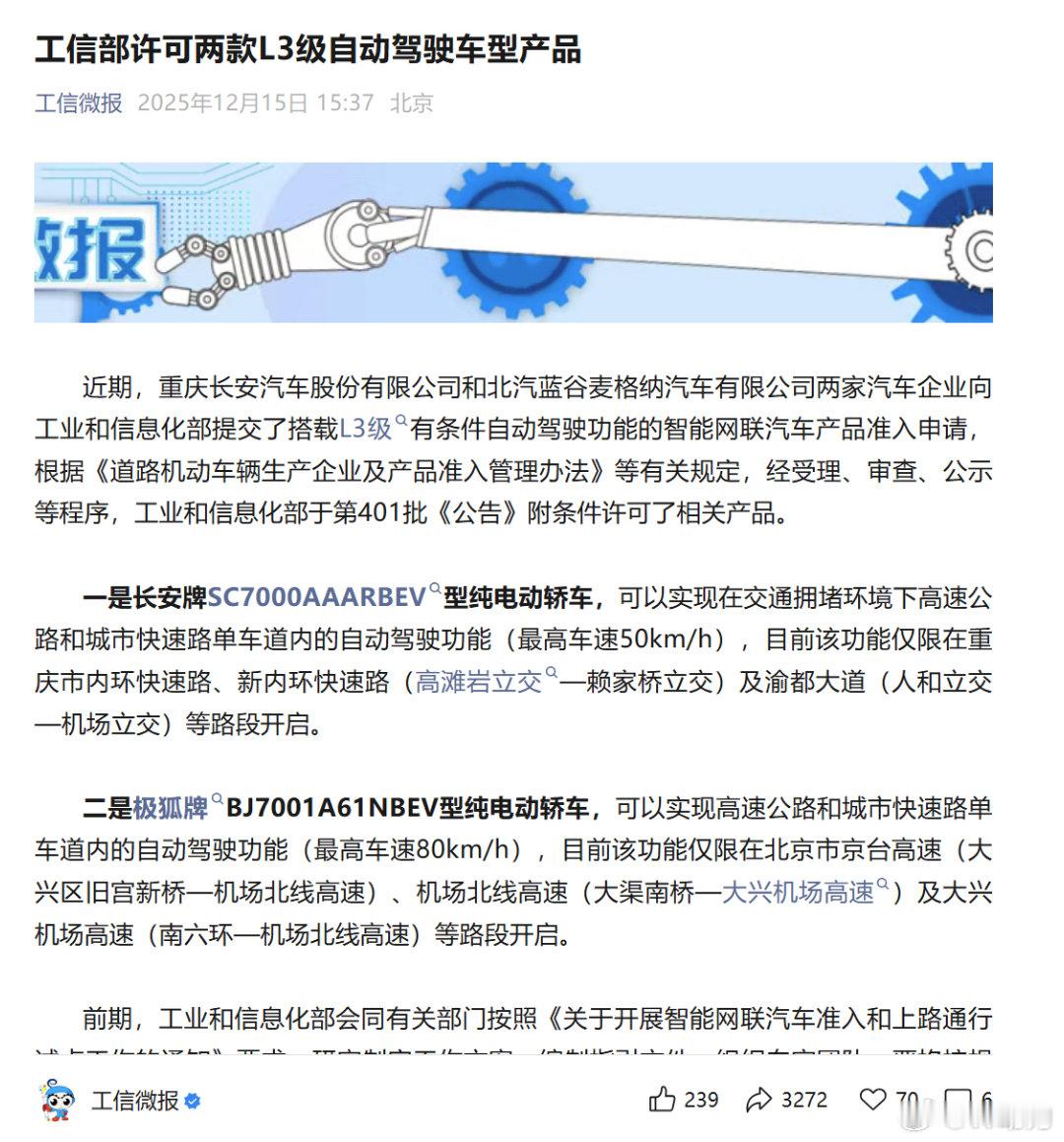 今日,工信部发布许可两款L3级自动驾驶车型产品,长安汽车旗下深蓝汽车首搭载!推动中国自动驾驶从“技术领先”迈向“规则领先”,助力中国智能网联汽车在全球赢得话语权和安全信任。我国首批L3自动驾驶车型获准入许可