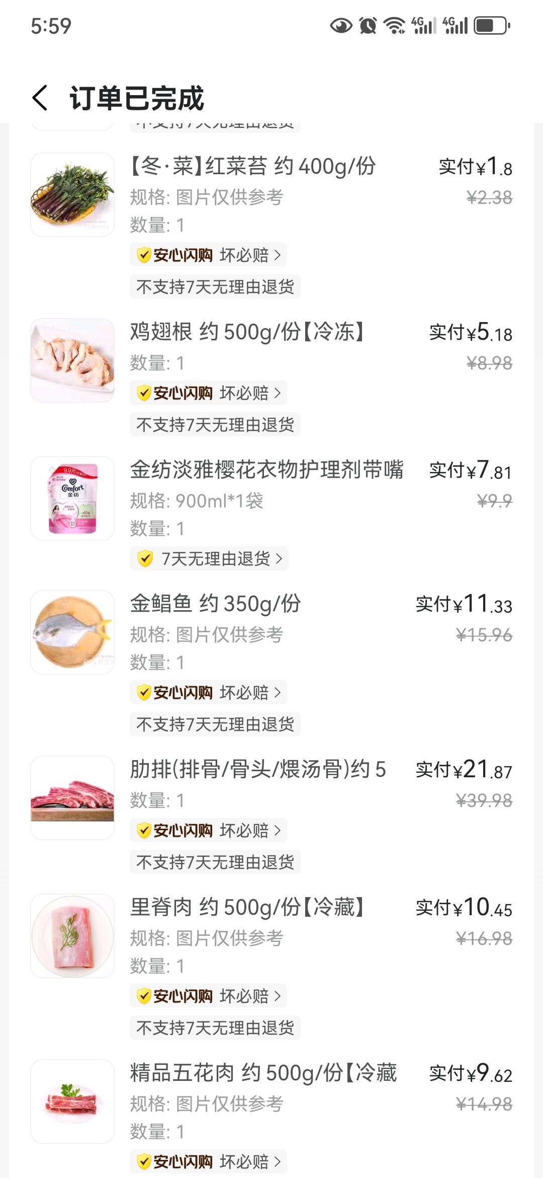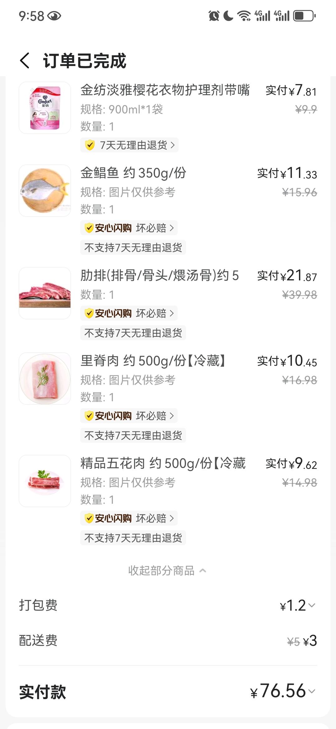 我真是个省钱小能手! 早上送完孩子去学校,准备去超市买点荤菜,儿子爱吃肉,不爱吃青菜,家里还有农家菜,光买点肉就可以了。 我习惯性点开网上购物平台逛逛,先了解一下城里各大超市商品价格,做到货比三家。 我先看沃尔玛,有机纯牛奶最近没啥优惠,果断退出,继续浏览看其他知名连锁超市,最后在另外一家连锁大超市网购了七七八八的生活必需品,优惠后连配送费和包装费一起总共才花了70多块钱,我和儿子还没到家,外卖小哥给我打电话说东西放我们家门口了。 我回到家里拆开包装仔细检查,肉类很新鲜,金鲳鱼和鸡翅根都还结着冰,紫菜苔也很新鲜,1.8元一大把,霜打后的紫菜苔比肉还好吃😋 你们会网购蔬菜和肉类吗?欢迎留言评论[比心] 生活省钱小窍门 生活省钱经验 买菜省钱技巧 购物省钱小窍门 省钱小记 省钱购物技巧 家庭省钱小技巧