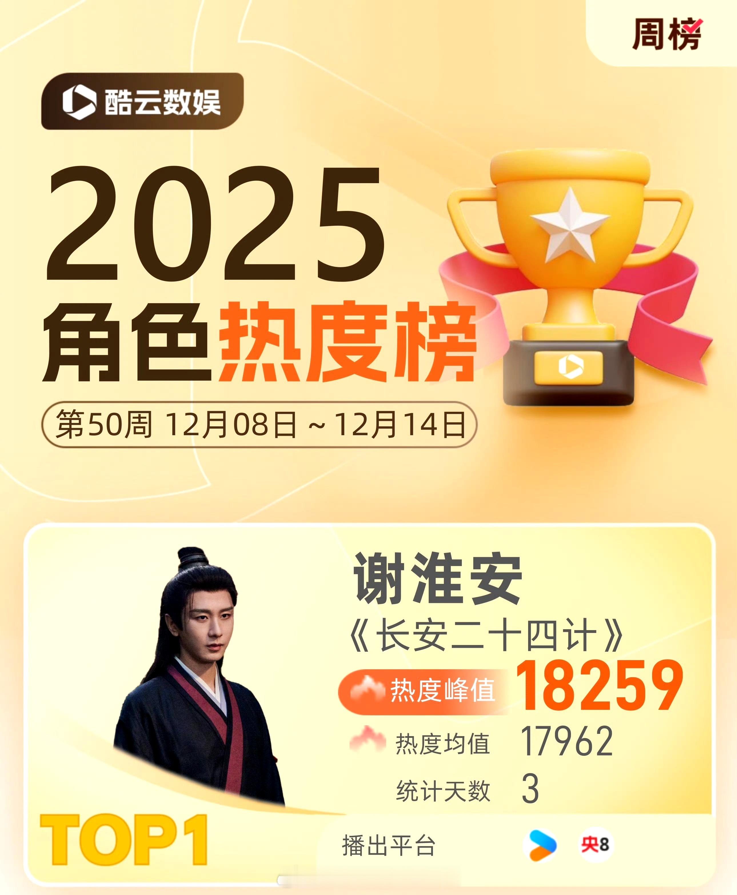 成毅长安二十四计谢淮安登顶全网角色热度周榜第一🔥