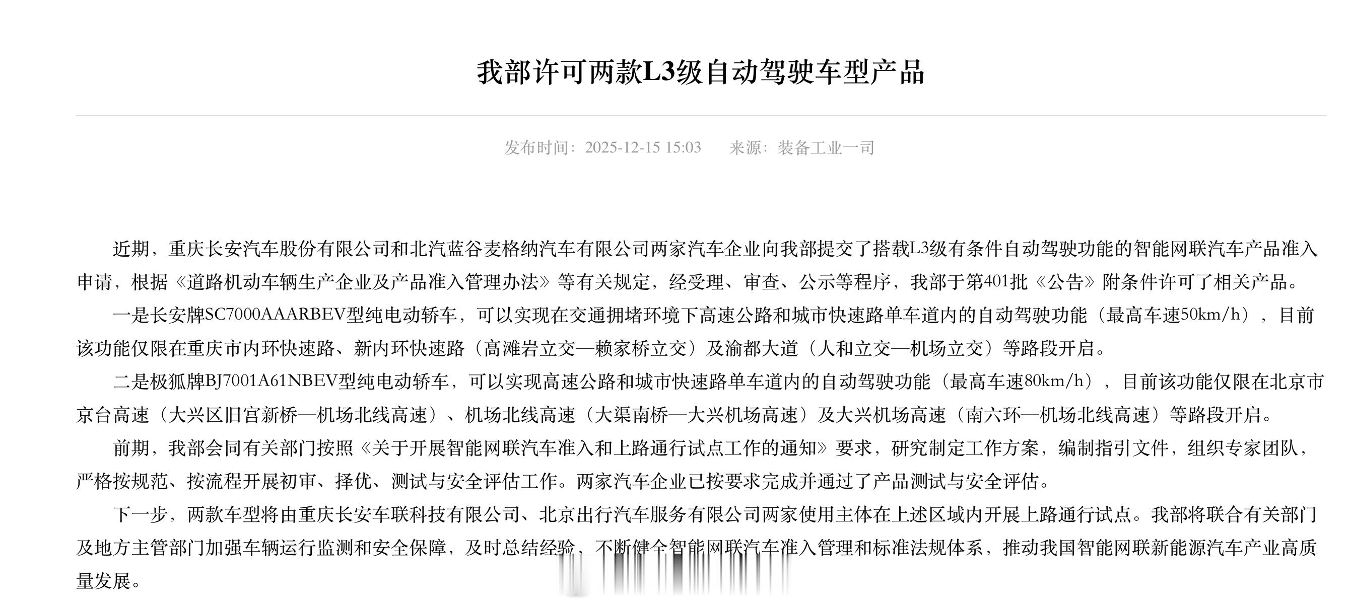 我国首批L3自动驾驶车型获准入许可两款 L3 级自动驾驶车型获得了工信部许可,L3 时代终于来了?刚刚工信部正式公布了我国首批 L3 级有条件自动驾驶车型准入许可,两款分别适配城市拥堵、高速路段的车型将在北京、重庆指定区域开展上路试点,标志着我国 L3 级自动驾驶从测试阶段迈入商业化应用的关键一步。这两款车型一个是长安牌 SC7000AAARBEV 型纯电动轿车,可以实现在交通拥堵环境下高速公路和城市快速路单车道内最高时速 50 公里的自动驾驶功能,目前该功能仅限在重庆市有关路段开启。二是极狐牌 BJ7001A61NBEV 型纯电动轿车,可以实现高速公路和城市快速路单车道内最高时速80公里的自动驾驶功能,目前该功能仅限在北京市有关路段开启。下一步,两款车型将由重庆长安车联科技有限公司、北京出行汽车服务有限公司两家使用主体在上述区域内开展上路通行试点。新能源汽车42how