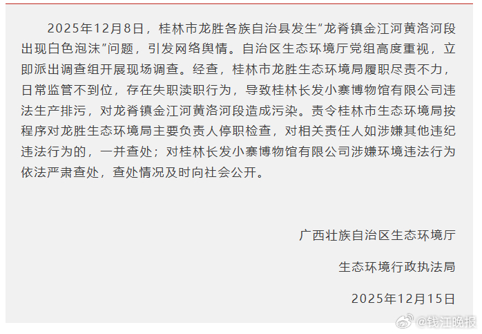 【#广西再通报河道出现泡沫污染问题# :存在失职渎职行为# 】12月15日,广西壮族自治区生态环境厅生态环境行政执法局发布“关于桂林市龙胜各族自治县龙脊镇金江河网络舆情的通报”称,2025年12月8日,桂林市龙胜各族自治县发生“龙脊镇金江河黄洛河段出现白色泡沫”问题,引发网络舆情。自治区生态环境厅党组高度重视,立即派出调查组开展现场调查。经查,桂林市龙胜生态环境局履职尽责不力,日常监管不到位,存在失职渎职行为,导致桂林长发小寨博物馆有限公司违法生产排污,对龙脊镇金江河黄洛河段造成污染。责令桂林市生态环境局按程序对龙胜生态环境局主要负责人停职检查,对相关责任人如涉嫌其他违纪违法行为的,一并查处;对桂林长发小寨博物馆有限公司涉嫌环境违法行为依法严肃查处,查处情况及时向社会公开。回顾事件,12月8日,有网友爆料称,广西桂林龙胜县一河道出现大面积泡沫,疑似遭到污染。12月9日,记者分别电话联系了桂林市龙胜生态环境局和龙脊镇人民政府询问处置进展。桂林市龙胜生态环境局工作人员回应称,该单位相关人员已经在现场处置。12月9日中午,桂林市龙胜生态环境局发布情况通报称,事情发生后,该局迅速会同龙脊镇人民政府前往现场进行实地核查。经调查,发现系桂林长发小寨生物科技有限公司的废水蓄水罐部分废水外溢,流入金江河黄洛河段,致使水面出现白色泡沫。该局立即责令涉事企业停业整改,并委托第三方检测公司按照操作规范在事发地多处进行了样本采集,后续将根据调查结果依法依规作出相应处理。记者通过天眼查检索显示,桂林长发小寨生物科技有限公司主要从事生物发酵技术开发,日化用品、化妆品生产、销售,中药材加工、销售;农副产品加工、技术开发、销售等。此次官方通报的桂林长发小寨博物馆有限公司,系此前通报的桂林长发小寨生物科技有限公司控股公司。(潮新闻 记者 季建荣)