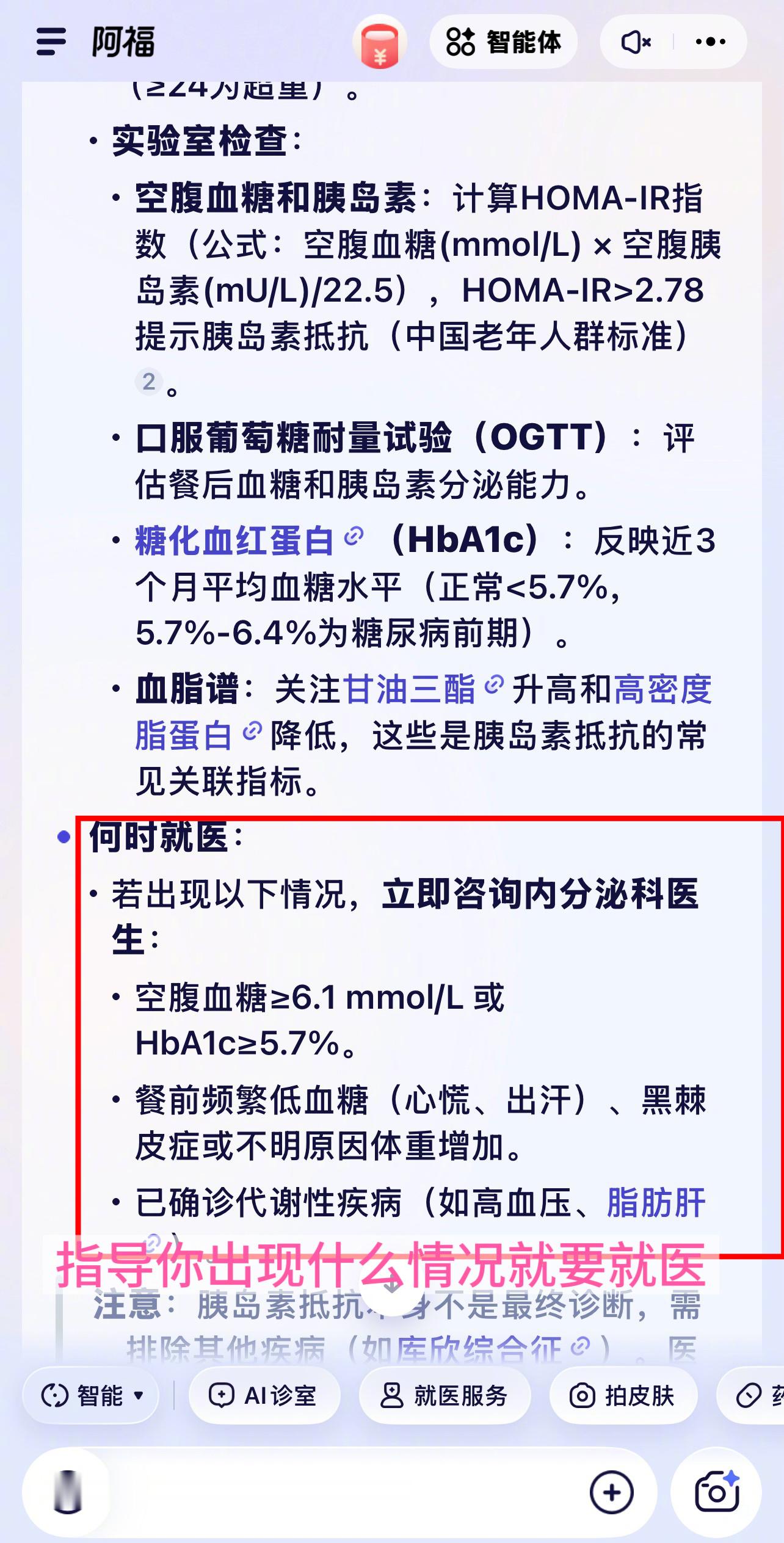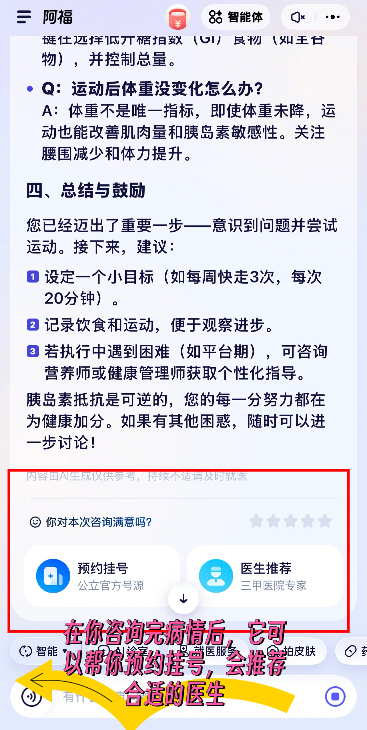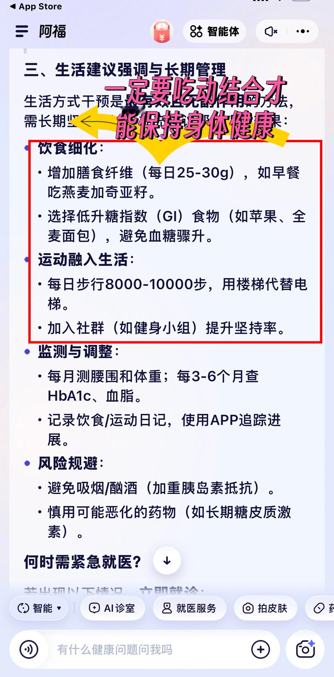 AI医生朋友阿福来了 前两天看到一段话,大意是:在当下这个时代,真正的红利只有一个——就是保持身体健康!因为现在的人卷的已不再是工作、房子和车,而是好身体、好心态和高质量睡眠。在这样一个信息过载的时代,当别人焦虑失眠时,只有你能吃得下、睡得好、情绪稳定、精力充沛,那你就拥有了这个时代最稀缺、最硬核的“资产”。而科技爆炸带来的寿命红利,也只有真正活得足够长、足够健康的人,才能接得住。我真的太同意这一说法了,有什么都没有比有个好身体更重要!今年夏天看到蚂蚁集团推出AQ后,我第一时间就给父母和自己都下载了。现在,老妈稍有点风吹草动、不舒服就会第一时间问它。老爸体检测出缺钾后,除了按医嘱吃药,他还主动问AQ日常饮食该怎么补钾,现在每天都会自觉吃香蕉🍌补钾(以前怎么劝都没用,因为他不爱吃香蕉)。最近看到AQ升级成了蚂蚁阿福,会结合过往记录和健康档案,给出更有针对性、也更精准的建议,对父母来说就更加友好了。加上我父母本身属于学习型,教会他们怎么用之后,现在已经很习惯“有事先找阿福”。尤其偏爱AI问诊功能,AI 给出的回复清晰、系统又科学,比自己乱搜索问人靠谱多了。对他们来说,有了它就像身边多了一个随时能咨询的健康助手,还会结合过往的健康状况给出针对性的建议。而且阿福还能像真人一样追问,爸妈有时候只知道自己“头疼”、“腰痛”,但说不出是前额疼还是弯腰时疼、有没有伴着恶心或发麻,它就会一步步引导“描述一下具体的区域?” “疼的时候有没有伴随其他症状”帮着梳理清楚症状。而我自己,则是直接把阿福当成了个人健康朋友。日常控糖、饮食调整、定制运动方案,都会先问问它,再结合自身情况慢慢执行。整体用下来,我最大的感受是:健康管理不再是临时抱佛脚,而是很自然地融入到了日常生活。而每一次咨询后,都能让医学常识储备增加一些,受益匪浅。真的很推荐大家给父母,也给自己下载一个。AI 对现代人的帮助可以说是巨大的,尤其是这种健康类的AI。你完全可以让它为你所用,成为贴身的健康朋友。父母不会打字也没关系,直接语音输入就好,它连方言都能识别,对长辈非常友好。说到底,在这个时代,照顾好自己,是最值得的投资;照顾好家人,是最踏实的安心。愿我们都能把健康握在自己手里,活得长久,活得踏实。AI医生请回答 戳此下载蚂蚁阿福