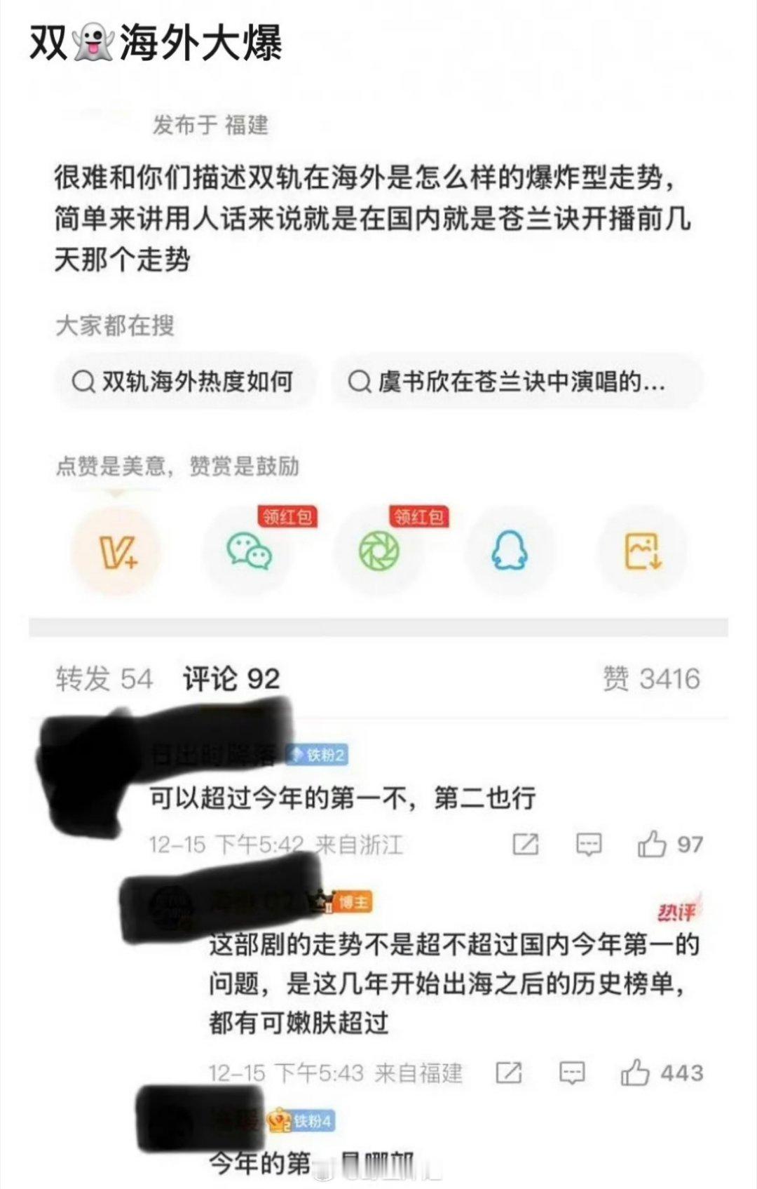 有人发帖说虞书欣主演的《双轨》在海外爆了,在海外的爆炸型走势就是之前《苍兰诀》在