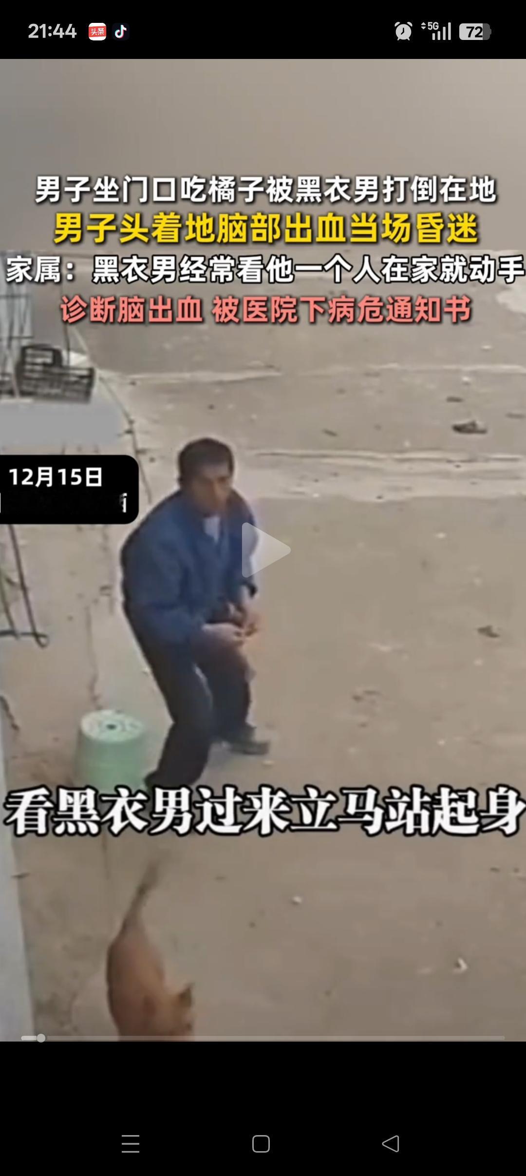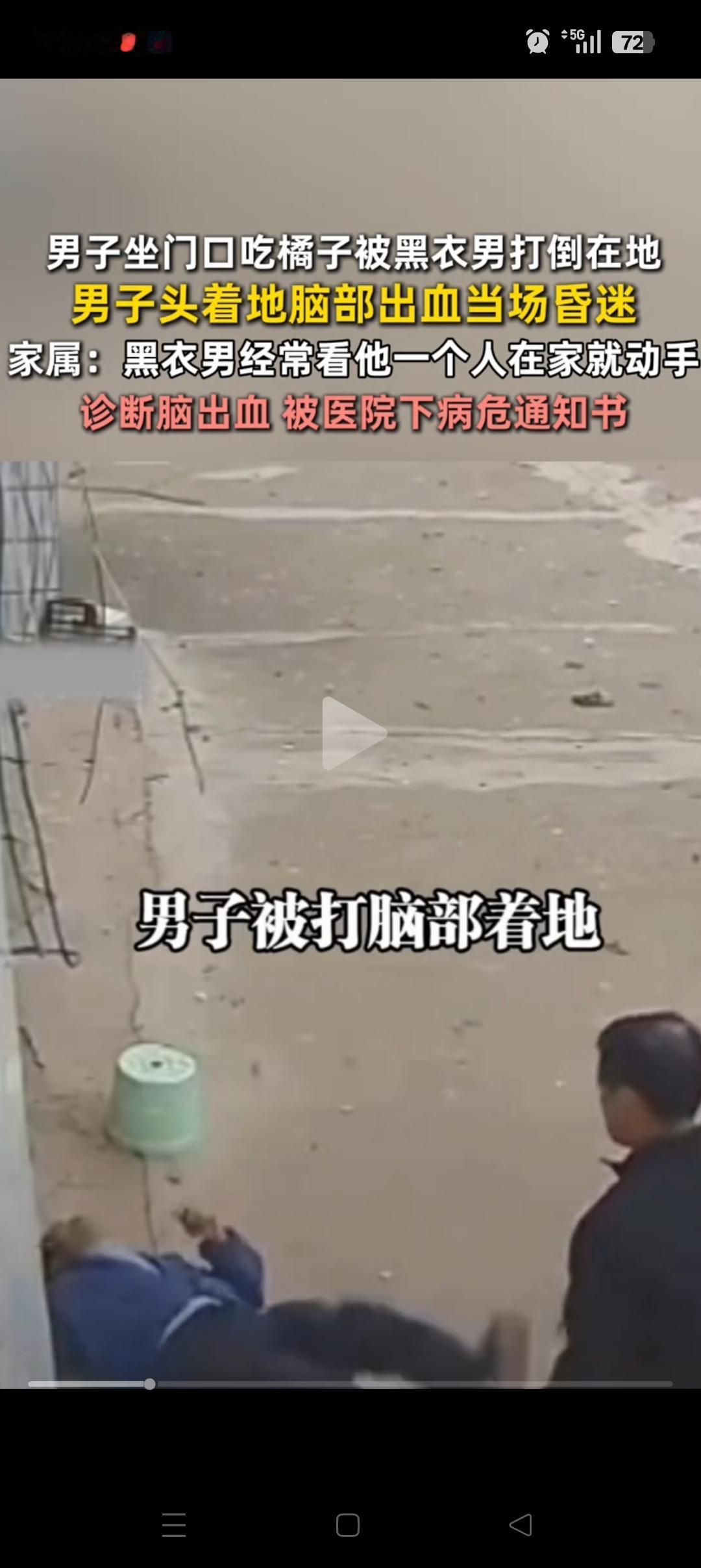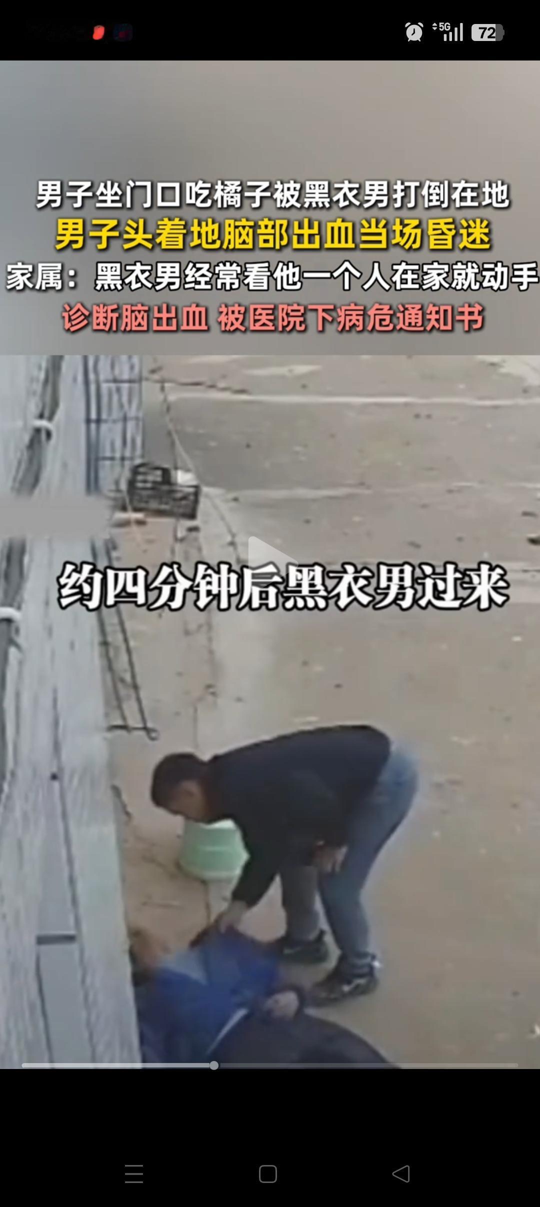 “必须严惩”,江西,残疾男子在家门口吃橘子被打,打人男子被抓后却以身体不舒服为由被释放了。残疾男子家属透露:我爸爸呕吐,脑袋出血,一度昏迷。打人者也不是第一次打爸爸,这次是看我家没人,又欺负我爸。 从视频上看,那一拳确实还挺重的,两个人也并没有说太多话,对方显然是有备而来的。 打人者以不舒服为理由,可以先离开。但是后续必须要有医院提供的合理记录,确实是需要在家里休息才行。 而且等他恢复后,该赔偿的要赔偿,承担的责任也不能少。希望当地能够终重视起来,必须严惩。。
