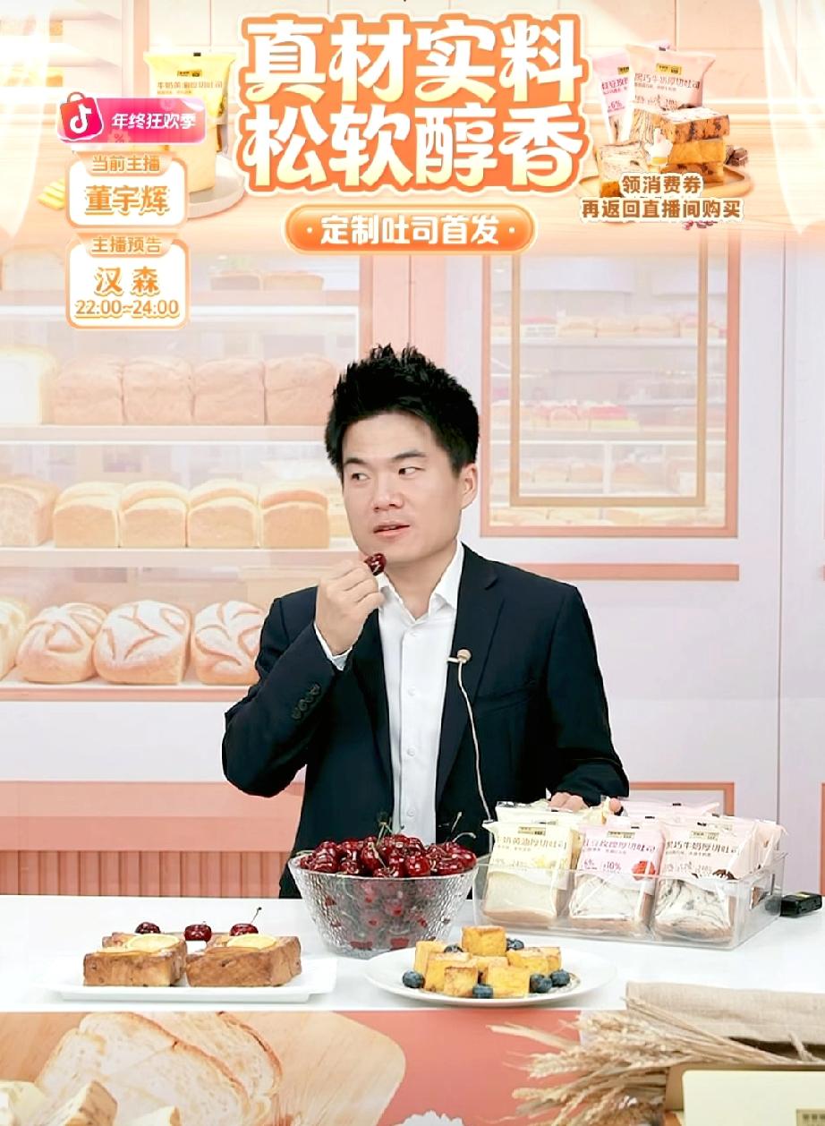20万单定制吐司瞬间秒没!有没抢到的网友问董宇辉,你回来干嘛?董宇辉说:“我回来吃车厘子的。” 不过宇辉说了,下周会再上一批。他安慰大家,你没抢到正好让大家先尝尝,反馈一下好不好吃,如果好吃,你下周再买,如果不好吃,你就不要买了。 可是网友们想我也想先尝为快呀。或许是因为与辉同行定制的物品,不管是食品还是用品,从来都没有让大家失望过,所以大家也都很放心购买吧。 宇辉还透露个好消息,就是定制牛肉过几天要上一批。 没抢到吐司的朋友过几天抢牛肉吧! 董宇辉 与辉同行