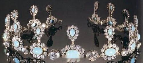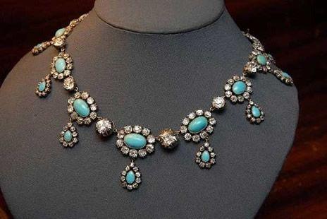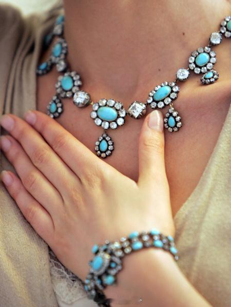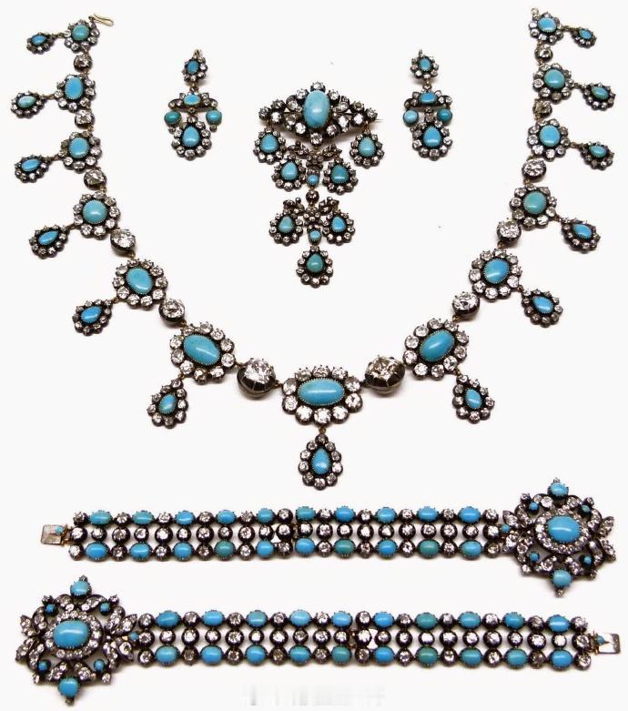 绿松石套装,包括可改成王冠的项链、一对手链、耳环和胸针,约1830年制成 曾属于意大利末代王后玛丽-何塞,最开始的主人是她奶奶,比利时王后玛丽 意大利共和后玛丽-何塞保留了很多私人珠宝,2001年她死后把包括这套绿松石在内的部分珠宝留给了小女儿玛丽-加布里拉,后者2007年把这套交给了佳士得卖出了约24万美刀,前些年二次拍卖,下落不明 说来也奇怪,这套除了佳士得模特没见其他人的佩戴照,项链感觉还可以啊,钻挺大