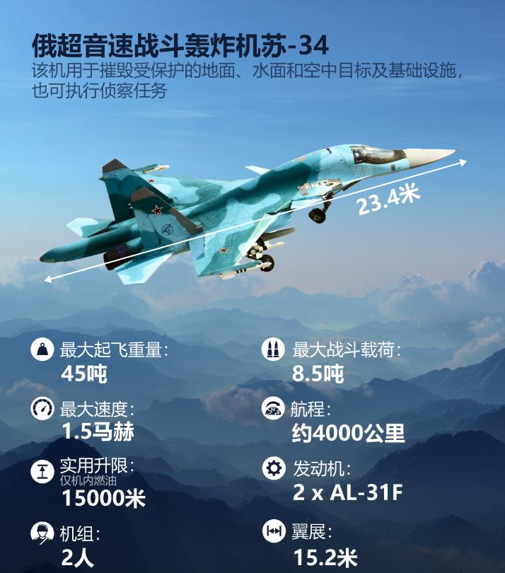 俄罗斯军方向作战前线部署新型苏-34战机。 其主要参数: 最大速度:1.5马赫 航程:约4000公里 实用升限:最高15000米 最大战斗载荷:8.5吨