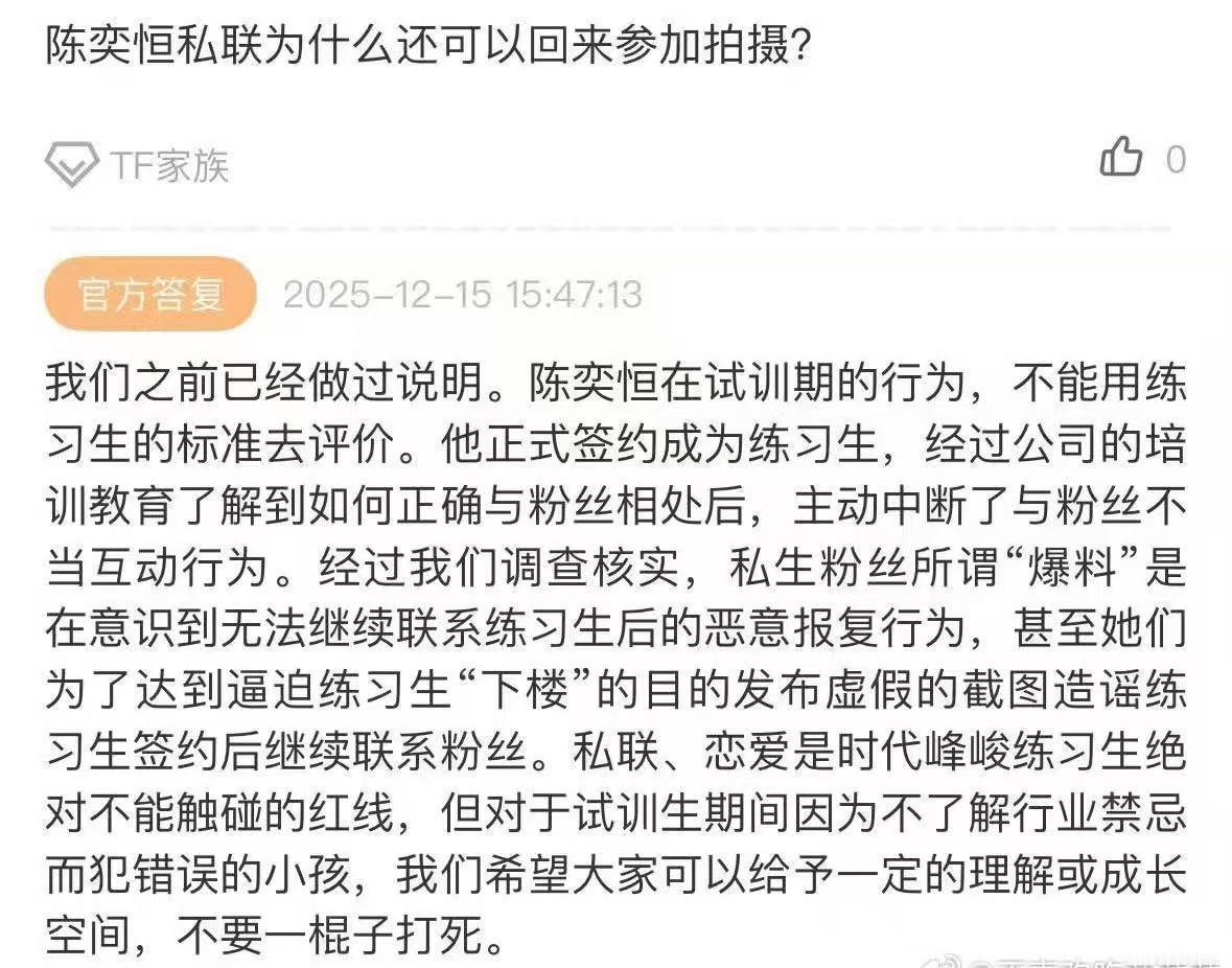 时代峰峻要给陈奕恒一定成长空间时代峰峻的回应来了