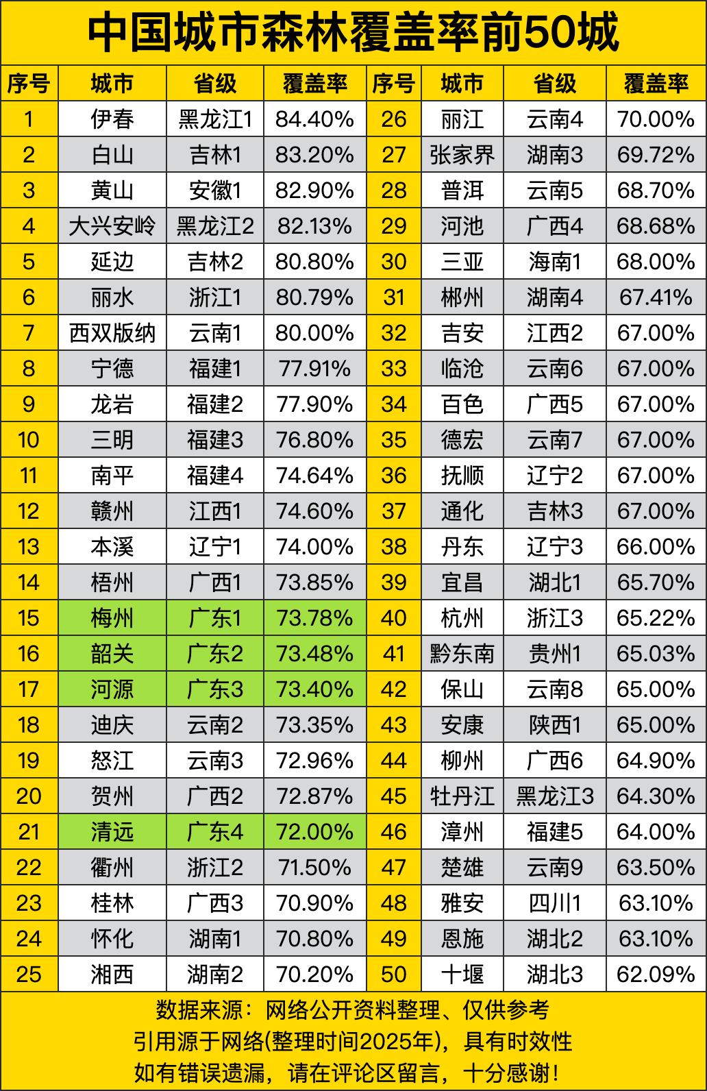 伊春那可是相当霸气,以84.40%的森林覆盖率一骑绝尘,稳稳地坐在了冠军宝座上。这就好比在一片城市森林的赛场上,伊春穿着一身翠绿的战衣,把其他城市远远甩在身后,那优势,杠杠的!白山和黄山也不甘示弱,一个83.20%,一个82.90%,紧紧跟在后面,仿佛在说:“伊春你别得意,我们追上来啦!” 再瞧瞧后面的城市们,也是各有各的“绿色实力”。这些城市的森林覆盖率都在70%以上,一个个就像是城市里的“绿肺”,给城市居民们提供了清新的空气和舒适的环境。不过,这差距也是一目了然啊,有的城市高得让人惊叹,有的城市虽然也在榜单上,但和其他城市一比,就显得稍微逊色了那么一点点。 但不管怎么说,能登上这个榜单,就已经说明它们在绿化方面下了不少功夫。咱就说,城市之间的竞争可真是无处不在啊,连森林覆盖率都要比一比。希望这些城市都能继续保持,说不定下次再看这榜单,又有新的变化呢!咱老百姓啊,就盼着生活在这越来越绿的城市里,每天都呼吸着新鲜的空气,心情也跟着美美的!